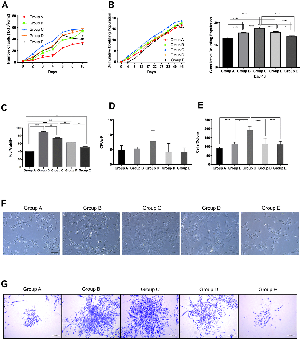 CFU-F assays were carried out to quantify the colony formation capacity of cells from all 5 maternal age groups. Cells were seeded at 1x103 and allowed to grow for 8 days; after staining with crystal violet, colonies with cell numbers <40 were counted. The results showed that Group C presented higher colony formation capacity (Figure 1D, 1E) than the other groups, whereas groups A and E showed the lowest number of colonies formed. Furthermore, when the number of cells per colony was counted (Figure 1G), Group C consistently showed more cells per colony than the other maternal age groups. Colony formation capacity correlated with the results obtained for CGC and CPD. Taken together, these results demonstrated that PDMSCs isolated from mothers aged 22-35 years have better self-renewal and proliferative capacity than cells isolated from mothers aged 18-21 or >36 years.