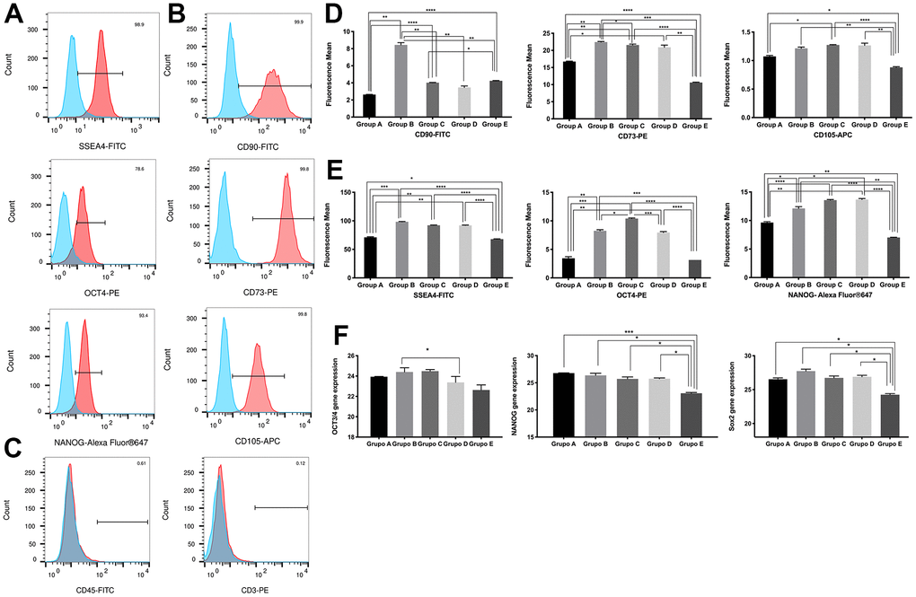 The effect of maternal age on the expression of multipotency and pluripotency markers in PDMSCs was analyzed by flow cytometry. PDMSCs were washed with Dulbecco’s phosphate-buffered saline (DPBS, Gibco) and resuspended in fluorescence activated cell sorting (FACS) buffer (Thermo Fisher Scientific) with FITC-conjugated anti-human CD90, PE-conjugated anti-human CD73, and APC-conjugated anti-human CD105 (BioLegend, CA, USA) for 20 minutes at room temperature in the dark. The cells were then washed with FACS buffer and resuspended in fixation buffer (Thermo Fisher Scientific). For intracellular staining, the cell membrane was permeabilized with 1x Perm buffer (BioLegend) for 20 minutes at room temperature. The cells were resuspended in 1x Perm buffer with PE-conjugated anti-human OCT4, FITC-conjugated anti-human SSEA4 and Alexa Fluor® 647-conjugated anti-NANOG antibodies for 2 hours in the dark. The cells were then washed and resuspended in fixation buffer. The fluorescence intensity of 20,000 cells was recorded on a flow cytometer (Guava, Merck) and analyzed using FlowJo software with excitation/emission wavelengths 494/520 for FITC, 496/578 for PE, 650/660 for APC and 650/660 for Alexa Fluor® 647.