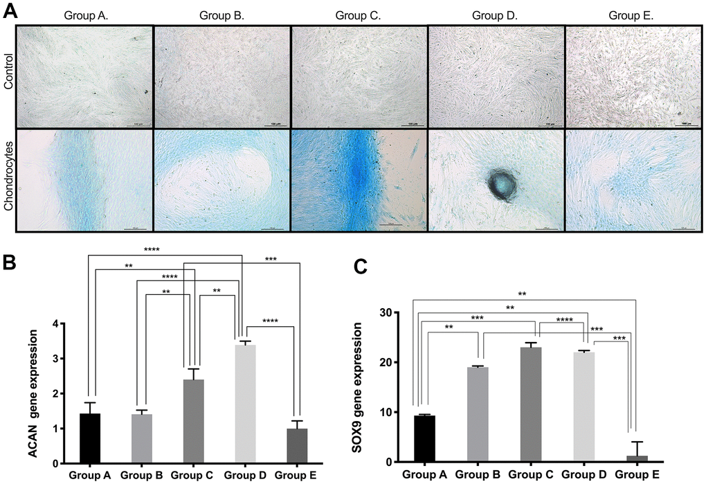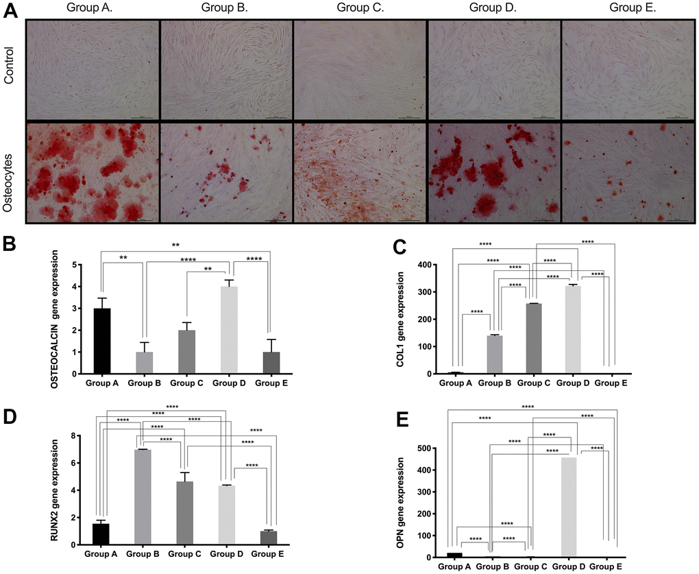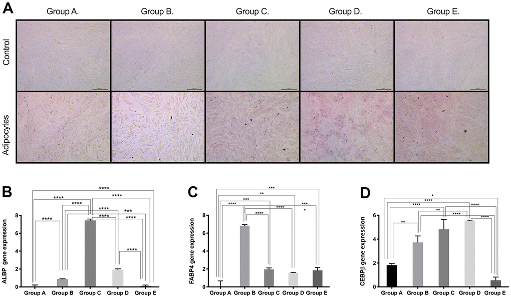 Based on the results obtained for the expression of pluri- and multipotency markers as an indicator of cell plasticity in PDMSCs among all 5 groups, we then induced mesenchymal multilineage differentiation to understand the effect of maternal age. All groups included in this study were differentiated into chondrogenic, adipogenic and osteogenic lineages. Chondrocytes stained positive for Alcian Blue, in contrast to undifferentiated controls (Figure 3A), indicating the synthesis of proteoglycans by chondrocytes. We then confirmed chondrogenic differentiation by RT-qPCR analysis of the gene expression of the chondrogenic markers Aggrecan (ACAN) and the transcription factor SOX9. ACAN showed significantly (p<0.0001) higher expression (~2.5- to ~3.5-fold change) (Figure 3B) along with a >20-fold increase in the transcription factor SOX9 expression (Figure 3C), in groups C and D compared to the other groups, consistent with the Alcian blue staining. Oil Red O, a dye that stains triglyceride and lipid deposits, showed positive staining for adipocyte-differentiated cells, in contrast to the undifferentiated controls (Figure 4A). Adipocyte lipid-binding protein (ALBP) gene expression confirmed adipogenic differentiation, with significantly (p<0.0.0001) higher expression (~7-fold change) in cells from group C than in cells from the other groups (Figure 4B), as well a 6-fold increase of the fatty acid-binding protein 4 (FABP4) and >3.8-fold of CCAAT/enhancer-binding protein beta (CEBPB) in group B, C, or D (Figure 4C, 4D). Osteocytes stained positive for Alizarin Red (Figure 5A), a stain that identifies calcium-containing osteocytes in differentiated culture. Osteocalcin gene expression confirmed osteocyte differentiation (Figure 5B) and showed significantly (p<0.0.001) higher expression in groups D (~4-fold change), A (~3-fold change), and group C (~2-fold change) than in the other groups. The expression of other osteogenic differentiation markers, such as collagen type 1 (COL1) and Runt-related transcription factor 2 (RUNX2), were highly upregulated in groups B, C, and D (Figure 5C, 5D), with more than 400-times increase of osteopontin (OPN) gene expression in group D (Figure 5E). Taken together, the results showed that although groups B, C and D presented higher expression of pluri- and multipotency markers, after induction of differentiation, groups B, C and D showed the highest differentiation potential, and group A also showed an elevated capacity for osteogenic differentiation compared to that of the undifferentiated controls.