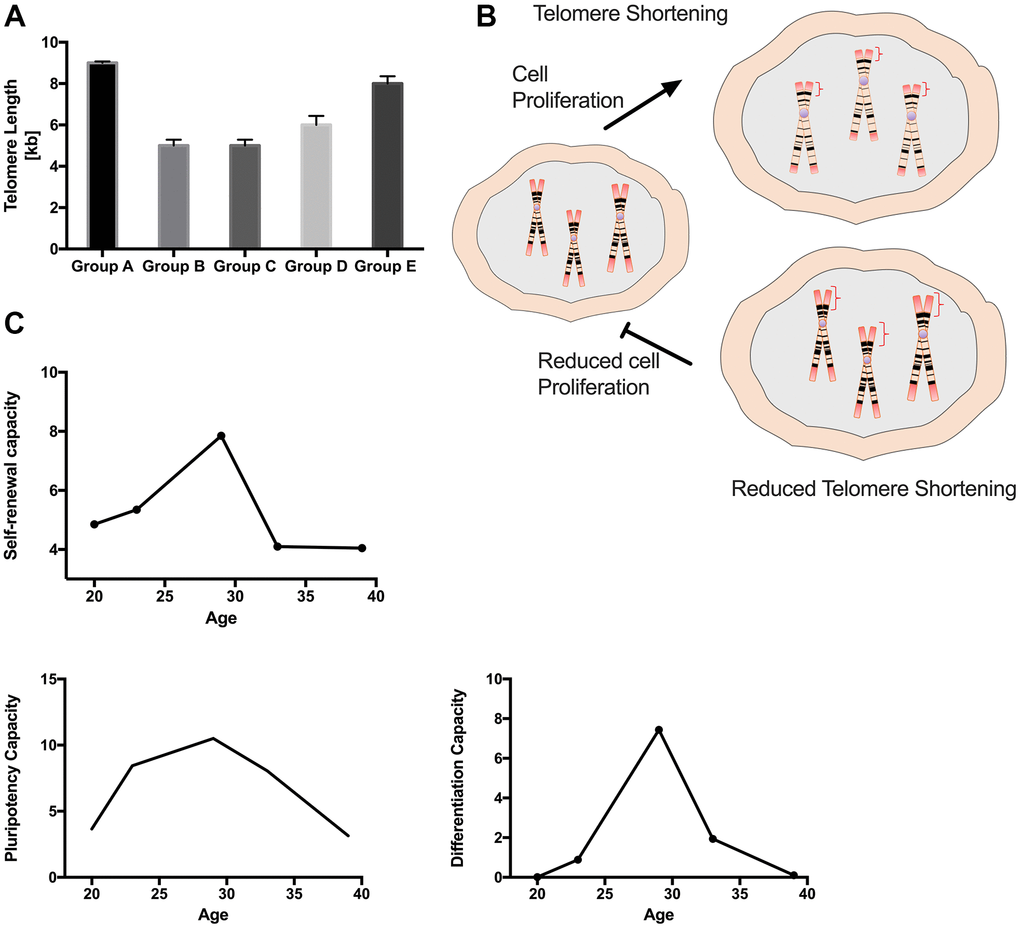 MSCs are an attractive source for cell therapy owing to their unique self-renewal ability, multipotency, and ease of isolation. However, these properties may vary depending on the tissue source and donor age. We demonstrated a clear correlation between donor age and the stemness properties of PDMSCs and investigated how their biological function is affected by age (Figure 7). We evaluated PDMSC self-renewal properties and multipotency capacity in 5 donor age groups. Our results lead us to suggest that PDMSCs isolated from mothers between 22 and 35 years of age demonstrated a higher growth rate, better proliferative capacity, and successful induction of differentiation into adipocytes, osteocytes and chondrocytes. We also reported increased telomere shortening in PDMSCs isolated from maternal ages between 22 and 35 years compared to PDMSCs from younger donors (18-21 years) or older donors (36 years and older).