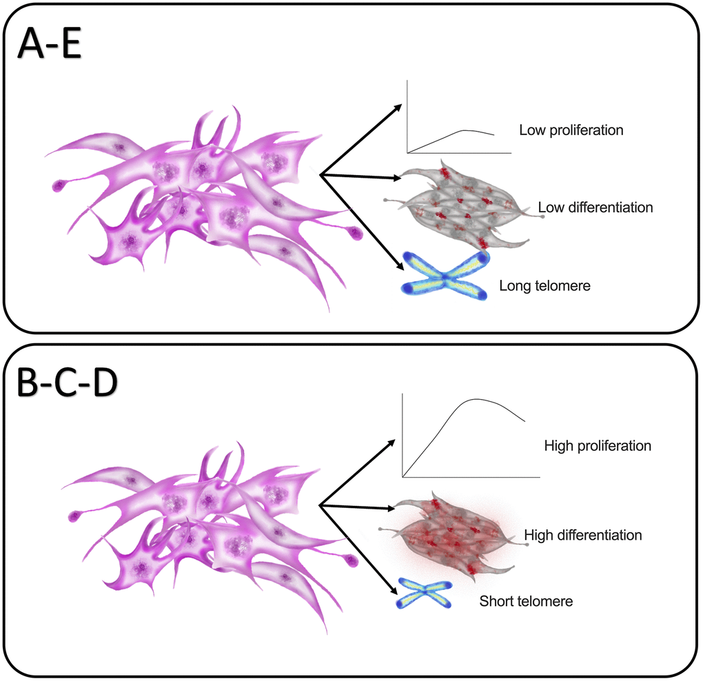 Telomere length is an important indicator of cellular senescence and replicative ability in cells. Studies have shown that in hMSCs, telomerase activity is undetectable, and telomere length gradually shortens with each cell replication [37]. Stem cells with multilineage differentiation potential and self-renewal capacity, such as PDMSCs, have mechanisms to maintain telomere length [38]. The use of adult-derived stem cells, such as AT-MSCs and BM-MSCs, is limited in clinical applications for cell therapy due to age-related cellular changes; hence, determining telomere length in PDMSCs may help characterize and understand biological differences. Here, we report that PDMSCs from mothers of median ages (22-35 years) exhibited shorter telomeres than PDMSCs from mothers aged 18-21 and >36 years, which exhibited longer telomeres. Our results revealed a negative correlation between telomere length and cell proliferation; groups A and E showed longer telomeres and a decreased cellular proliferation rate, and groups B, C and D presented shorter telomeres with an increased cellular proliferation rate, suggesting a correlation between cell proliferation and telomere shortening (Figure 4B). Our results are consistent with previous observations in fetal membrane-derived MSCs from sources other than the placenta from three donor age groups (GI: 20-29 years, GII: 30-39 years and GIII: 40 and over), in which decreased telomere length was reported in groups with increased proliferation rates [39].