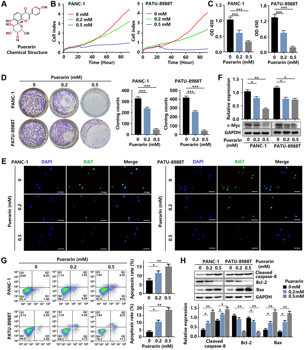 To investigate the effect of puerarin on PCC proliferation, the RTCA, CCK-8, and colony formation assays were performed. As shown in Figure 1B, 1C, as expected, puerarin treatment (0.2 and 0.5 mM) significantly inhibited the growth of PDACs in concentration- and time-dependent manners. The CCK-8 assay results of the PDACs confirmed the concentration-dependent inhibition of cell growth by puerarin (Figure 1B, 1C). Puerarin also significantly reduced colony formation in the PDACs (Figure 1D). To investigate the effect of puerarin on cell proliferation, we used immunofluorescence staining for the Ki67 marker expressed by proliferating cells. The level of Ki67 protein varied with the cell cycle and was higher in the G2/M phase and lower in the G0/G1 phase [17]. In the PDACs, we observed a decrease in Ki67 protein expression in both the PANC-1 and PATU-8988T cells treated with puerarin (Figure 1E) compared to the control cells. In addition, puerarin reduced the expression of proliferation-related protein c-Myc (Figure 1F). Therefore, the above results suggest that puerarin inhibited PCC proliferation in concentration- and time-dependent manners.