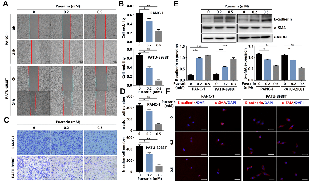 Enhanced cell migration and invasion abilities underlie PCC metastasis mechanisms, resulting in poor prognosis [19]. Here, puerarin reduced the migration rate of PDACs as determined by the scratch wound assay (Figure 2A, 2B) and the effect was concentration-dependent. Also, puerarin treatment significantly inhibited the numbers of invading PDACs detected by the transwell assay (Figure 2C, 2D). Further studies showed that puerarin decreased the protein level of α-SMA in PDACs and increased the E-cadherin protein level (Figure 2E). Immunofluorescence analysis revealed the downregulated expression of α-SMA and the increased expression of E-cadherin after puerarin treatment (Figure 2F). In general, these results suggest that puerarin inhibited PCC migration and invasion by inhibiting EMT and tumor mammosphere formation.