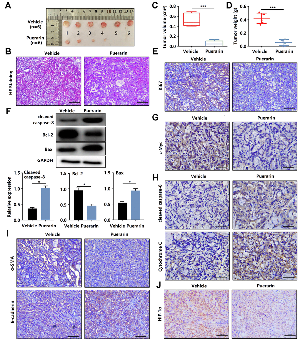 To determine the anti-cancer effects of puerarin in vivo, nude mice were injected with PANC-1 cells and then administrated puerarin or DMSO as a control. Figure 3A shows the morphology of tumor xenografts changes in the experimental group after puerarin treatment. The pathological results in the PDAC model tissue were shown by H&E staining (Figure 3B). We found that the administration of puerarin significantly reduced tumor volume and weight (Figure 3C, 3D). In addition, puerarin administration downregulated the expression of Ki67 and c-Myc (Figure 3E, 3F). Moreover, puerarin upregulated the expression of Cleaved caspase-8 and Bax, and decreased Bcl-2 expression (Figure 3G, 3H), suggesting that puerarin inhibited PCC proliferation and induced death receptor- and mitochondrial-mediated apoptosis. To assess whether puerarin inhibited PDAC migration, we examined the expression of EMT process-related proteins. The results showed that puerarin decreased α-SMA expression and increased E-cadherin expression (Figure 3I). It also reduced the expression of c-Myc, an oncoprotein associated with tumor progression and chemoresistance (Figure 3F) [20–22]. Hypoxia is usually observed in PDAC and some other solid tumors. HIF-1α protein, a key regulator of the hypoxia response, was found to accumulate in PDAC tissues. Several studies have shown that hypoxia was an independent predictor of poor prognosis [23]. We observed the downregulation of HIF-1α protein after puerarin treatment (Figure 3J). In summary, these data suggest that puerarin inhibited the growth of PDAC in a mouse xenograft model.