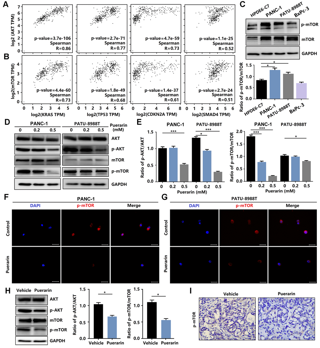 Anti-cancer effects involve many mechanisms, including oxidative stress, intrinsic and extrinsic mechanisms, as well as the survivin, PI3K/Akt/mTOR, SHH [24], Nrf2/Keap1 [25], inflammation, and autophagy pathways [26]. Studies have shown that the signal transduction pathway mediated by phosphatidylinositol 3 kinase (PI3K) was closely related to cancer occurrence. Many downstream molecules make up the PI3K/Akt signal pathway, including mTOR, one of the more important targets of rapamycin. mTOR signaling plays a crucial role in cell growth, protein translation, autophagy, and metabolism [27]. In Pancreatic tissue, including PAAD (Pancreatic adenocarcinoma) Tumor, PAAD normal and pancreas, the activation of mTOR was associated with gene mutations, including KRAS, TP53, CKDN2A, and SMAD4, resulting in tumor development (Figure 4A, 4B). We also found that these PCCs exhibited heterogeneous PI3K/Akt/mTOR pathway activation at the protein level (Figure 4C). In this study, we investigated the effect of puerarin on mTOR activity in PDACs. We found that puerarin suppressed the mTOR signaling pathway (Figure 4D, 4E), suggesting that mTOR may be a target of puerarin. Puerarin-induced the downregulation of phosphorylated mTOR expression in PDACs (Figure 4F, 4G). The in vitro experiments confirmed that puerarin inhibited the overexpression of mTOR in PDAC tissues (Figure 4H, 4I).