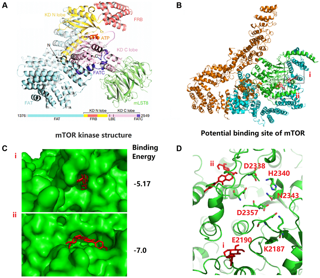 To further analyze the biochemical pathways of puerarin affecting mTOR protein, we used Autodock (MGLTools-1.5.6) to rigidly dock puerarin with the FAT domain (blue cartoon) and the kinase domain (KD, green cartoon) areas of mTOR (Figure 5A). We found that the possible binding sites of puerarin and mTOR included two structural regions i and ii (Figure 5B, 5C), with binding energies of −5.17 and −7.0, respectively. Figure 5D shows that there were many ATP-Mg complex binding-related amino acid residues around the i and ii binding sites. Once puerarin binds to the i and ii sites on mTOR protein, it may affect the activity of the above amino acid residues, and then affect mTOR activation activity.