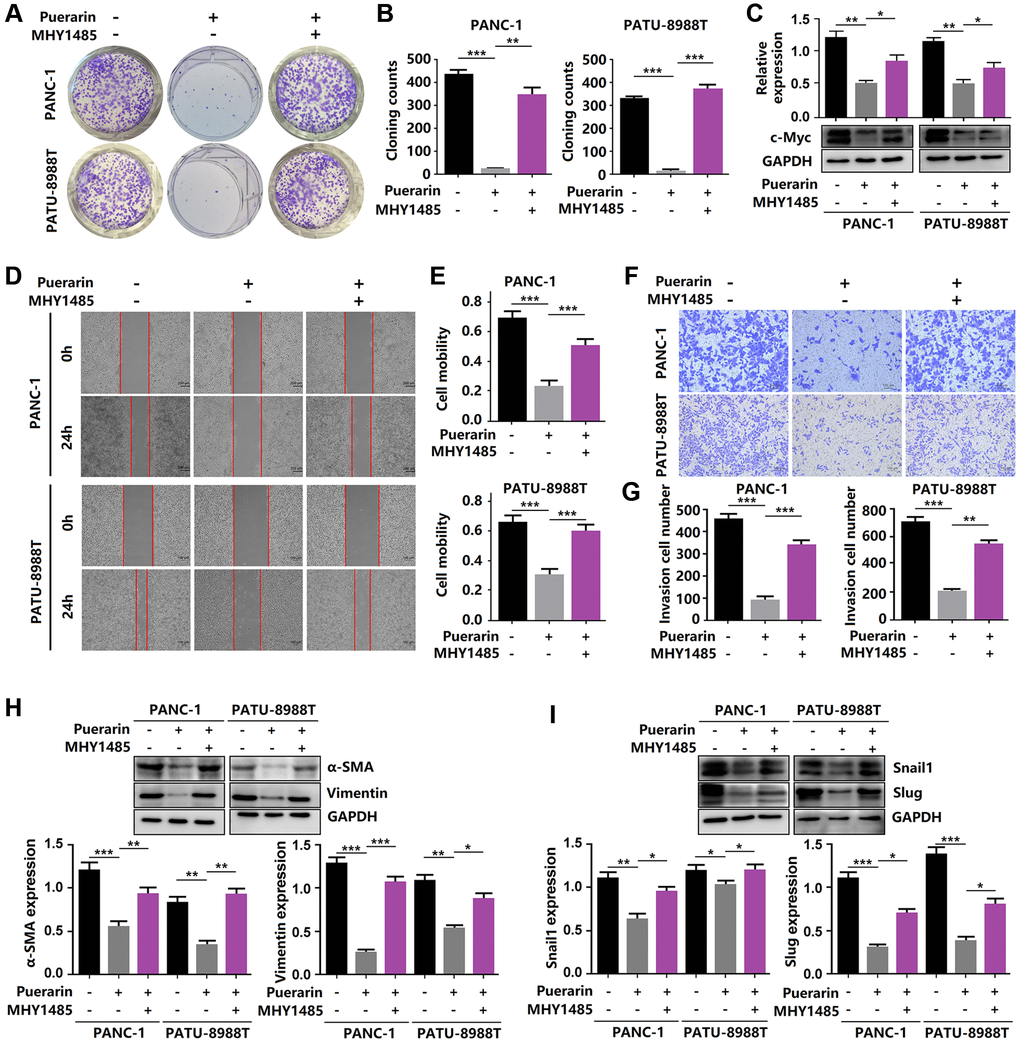 Given the anti-tumor effect of puerarin on PDAC by inhibiting mTOR signal transduction, we next investigated whether activated mTOR signal transduction influenced this effect of puerarin. In the PANC-1 and PATU-8988T cells, we used MHY1485, a significant cell permeability mTOR activator to activate the mTOR pathway, targeting the ATP domain mTOR. The activation of mTOR signaling eliminated the anti-proliferative effect of puerarin (Figure 6A–6C). Using the transwell and wound healing assays, we demonstrated that MHY1485 treatment increased the invasion and migration rates of the PDACs (Figure 6D–6G). Thus, activated mTOR signaling eliminated puerarin-mediated EMT suppression, as shown by the increased expression of α-SMA, vimentin, Snail1, and Slug (Figure 6H, 6I). These findings confirmed that mTOR signaling played a crucial role in the anti-tumor effect of puerarin in PDAC.