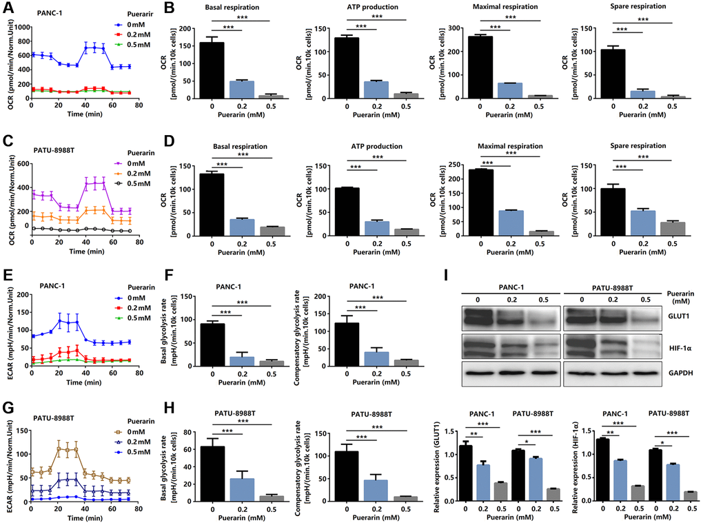 To satisfy the need for rapid proliferation, tumor cells need more energy, so the process of bioenergy metabolism targeting tumor cells is a new therapeutic strategy to inhibit the growth of tumor cells [28]. A bioenergy analyzer was used to measure the corresponding OCR and ECAR, and the effects of external factors on mitochondrial uptake and glycolysis were analyzed statistically. The primary respiration, ATP production, maximum respiration, and spare respiration of cells treated with puerarin decreased significantly (Figure 7A–7D), indicating that puerarin inhibited the energy metabolism of the mitochondria. The glycolysis of the tumor cells treated with puerarin was significantly inhibited (Figure 7E, 7G). The results showed that the basal glycolysis rate and the compensatory glycolysis rate decreased significantly (Figure 7F, 7H). Further studies showed that GLUT1 and HIF-1α protein expression was inhibited (Figure 7I). Considering the close connection between puerarin and the mTOR pathway, our research results indicate that puerarin may regulate downstream GLUT1 through the mTOR pathway and affect tumor cell metabolism.