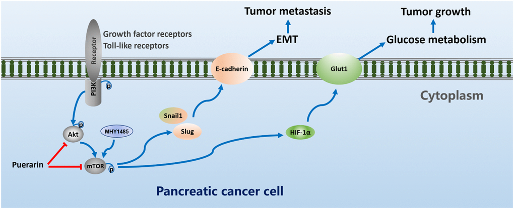 In conclusion, our results revealed that puerarin had a clear function in pancreatic cancer. It inhibited tumor cell proliferation and migration. Interestingly, our results suggest that the mTOR signaling pathway may play an important role in the anti-tumor process of puerarin. The process also involves downregulation of the OCR and the ECAR dependent upon HIF-1α and the glucose transporter GLUT1 to inhibit glucose uptake and metabolism. In addition, puerarin inhibited the migration and invasion of PCCs by antagonizing the EMT. In the nude mouse model, puerarin inhibited the growth and metastasis of PDAC. Further studies showed that MHY1485, a small molecule activator of mTOR, could block the puerarin-mediated effect of inhibiting PCCs proliferation and inducing PCCs apoptosis (Figure 8). Therefore, puerarin has the potential to treat PDAC by inhibiting Akt/mTOR activity.