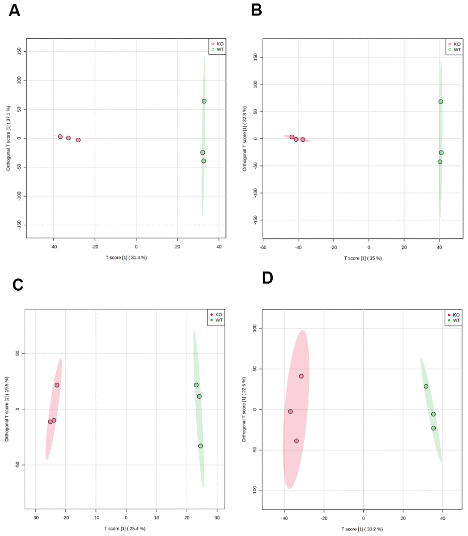 Representative base peak intensity (BPI) chromatograms were obtained from plasma in electrospray ionization positive (ESI+) and negative (ESI-) modes, respectively (Supplementary Figure 1A, 1B). All peaks in ESI+ or ESI- were merged and imported into the SIMCA-P software for multivariate statistical analysis. To investigate global metabolism variations, we first used principal component analysis (PCA) to analyze all observations acquired in both ion modes. As shown in the PCA plot (Supplementary Figure 2), an overview of all samples in the data can be observed and exhibits an unclear grouping trend between the two groups. To eliminate any non-specific effects of the operative technique and confirm the biomarkers, partial least squares discriminant analysis (PLS-DA) and orthogonal partial least squares-discriminant analysis (OPLS-DA) were used to compare metabolic changes between the two groups. In the PLS-DA score plot (Supplementary Figure 3) or OPLS-DA score plot (Figure 1A–1D), a clear separation of the two groups was observed. Univariate analyses, including fold change (FC) analysis and t-test, were performed on a volcano plot (Supplementary Figure 4). We selected metabolites with variable importance in projection (VIP) > 1.5, FC > 2.0, and P < 0.05 as significant compounds.