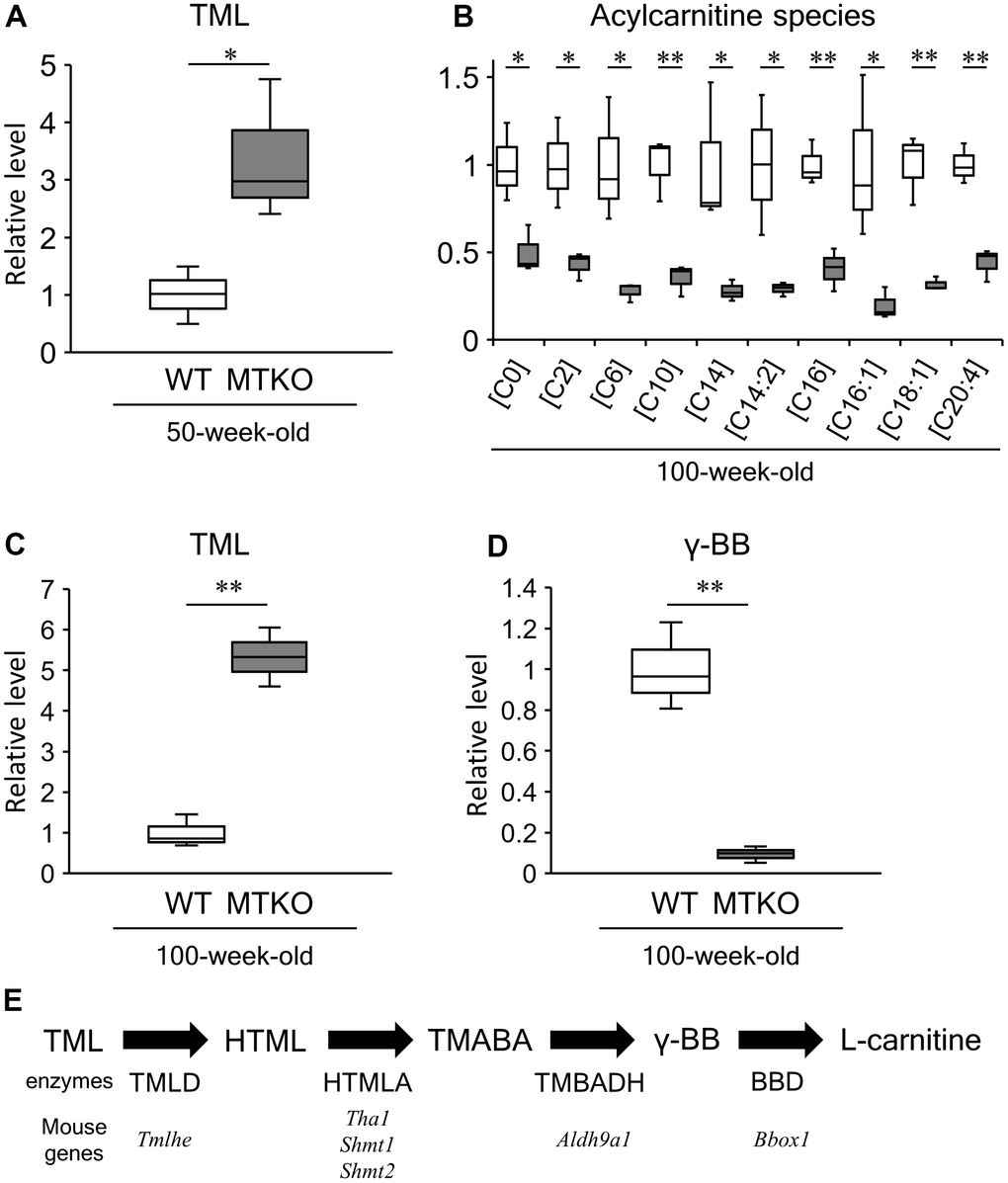 We identified 616 differential metabolites, of which 290 were detected in the positive ion mode and 326 in the negative ion mode in 100-week-old mouse plasma. HCA results of compounds with statistically significant differences between the MTKO and WT male groups are summarized in Table 2. The levels of 42 metabolites were higher, whereas those of 40 were lower in the plasma of MTKO mice than that in WT mice. Interestingly, many of these metabolites are involved in carnitine metabolism.