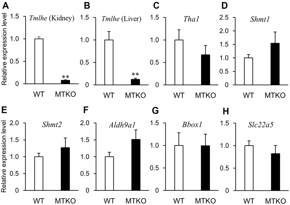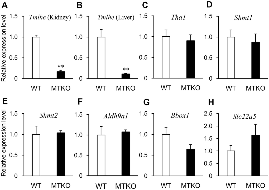 Among amino acids and their metabolites, the levels of taurine (2-aminoethane-1-sulfonic acid) and N-lactoylphenylalanine (P = 0.038, t-test, Table 1) were lower, whereas those of L-phenylalanine (P = 0.026, t-test, Table 1), L-lysine (P = 0.019, t-test, Table 1), N6,N6,N6-trimethyl-L-lysine (TML) (P = 0.035, t-test, Table 1 and Figure 2A), and histidylglutamic acid (P = 0.013, t-test, Table 1)were significantly higher in the plasma of MTKO mice than in that of WT mice. It has been reported that the plasma level of N-lactoylphenylalanine strongly correlates with plasma levels of lactate and L-phenylalanine [22]. Therefore, the low level of L-lactic acid could lead to L-phenylalanine accumulation in the plasma of MTKO mice. TML is an N-methylated compound of L-lysine. It is a component of histone proteins and an intermediate that is recognized as the precursor of L-carnitine (Figure 2E). The metabolic ability to L-lysine and TML may be weaker in MTKO mice than in WT mice. Hexadecanedioic acid, which is a long-chain dicarboxylic fatty acid, is converted to hexadecanedioylcarnitine by carnitine palmityltransferase (CPT) and is activated by mitochondrial fractions in the human liver for its degradation by β-oxidation [23]. In the plasma of MTKO mice, the concentration of hexadecanedioic acid (FC = 2.391, P = 0.001, t-test, Table 1) may be associated with the accumulation of TML as a carnitine precursor.