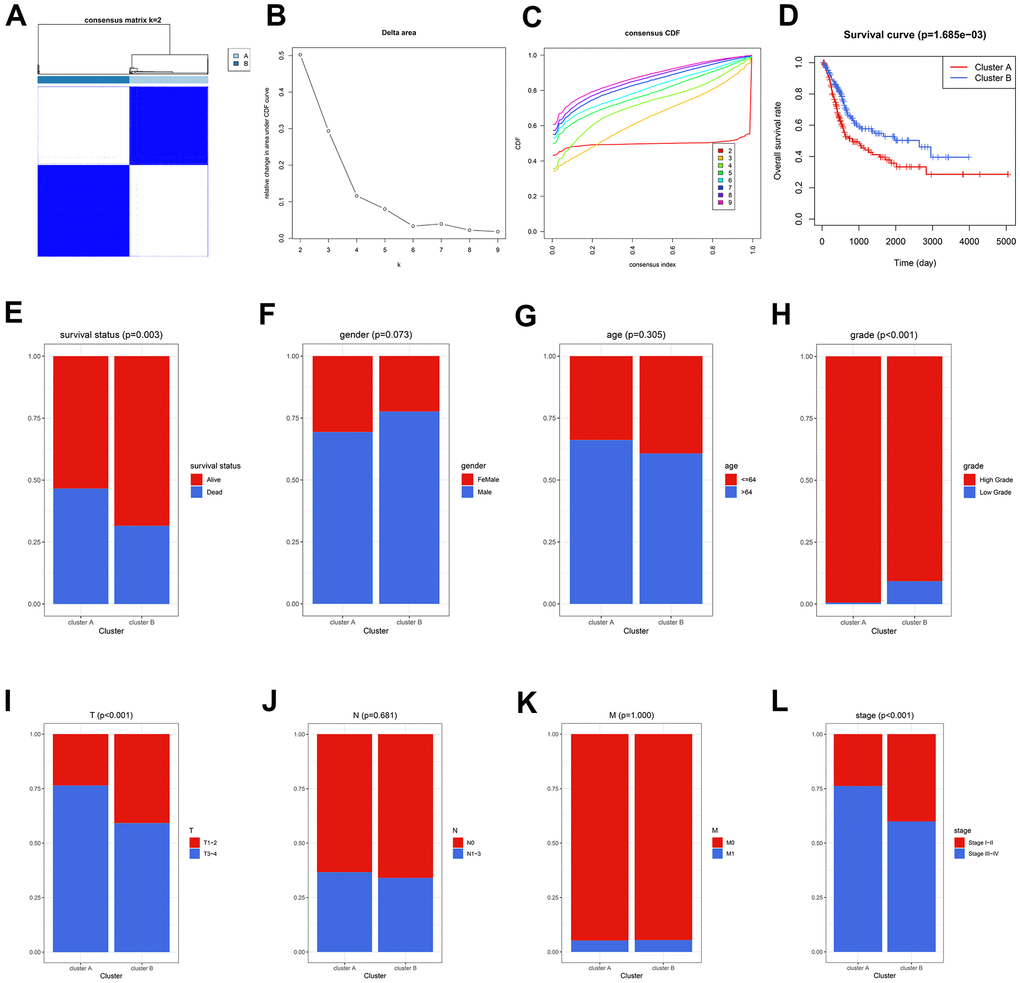 The circadian rhythm-related genes were retrieved from the Molecular Signatures Database (MSigDB, https://www.gsea-msigdb.org/gsea/msigdb/), as displayed in Supplementary Table 1. A sum of 290 circadian-related genes was extracted after excluding the overlapped genes. Accordingly, the Cancer Genome Atlas (TCGA) cases were clustered into two subgroups, containing Cluster A and B, via unsupervised clustering (Figure 1A–1C and Supplementary Table 2). The patients in Cluster A exhibited worse OS compared with those in Cluster B (P < 0.01, Figure 1D), and more deaths were observed in Cluster A (P < 0.01, Figure 1E). Besides, the circadian clustering was also significantly associated with the risk clinicopathological features, such as tumor grade (P < 0.001, Figure 1H), pathological T stages (P < 0.001, Figure 1I), and tumor stages (P < 0.001, Figure 1L), while gender (Figure 1F), age (Figure 1G), pathological N stages (Figure 1J), and M stages (Figure 1K) showed statistical non-significance. These analyses suggested that the critical role circadian rhythm played in BCa might be underestimated, and further exploration was demanded given the previous poor reports.
