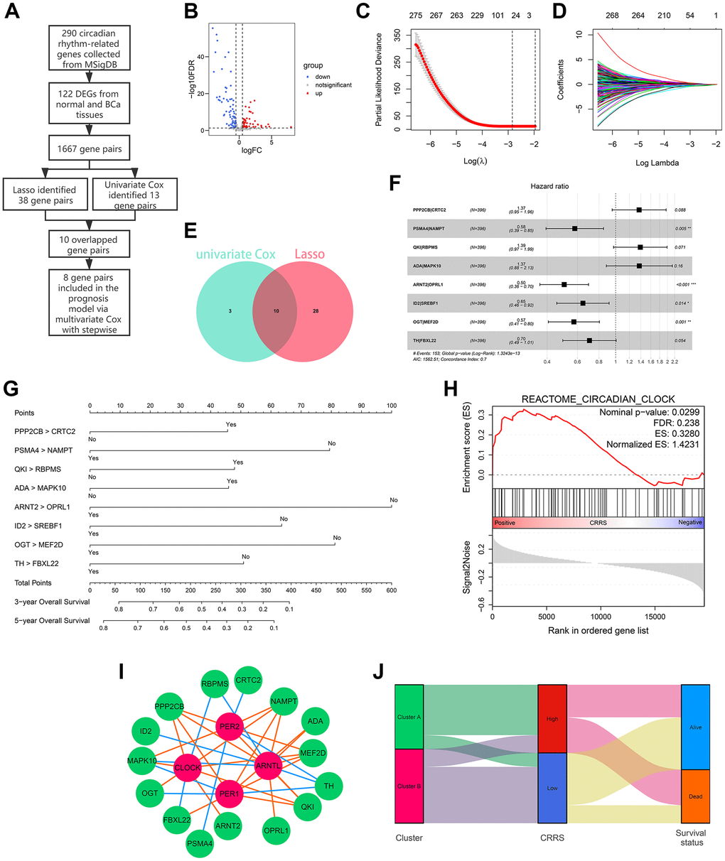 The present study collected the circadian rhythm-related genes from MSigDB, and accordingly, 396 BCa patients were grouped into two clusters. We found the clustering was significantly associated with overall survival rate (P < 0.01) and many other risk clinical parameters, enlightening us to develop a circadian rhythm-related signature to identify significant biomarkers. To make the risk model widely appliable for the samples tested by RNA-seq, microarray, or RT-qPCR, a gene-pair strategy was adopted to construct the prognostic model based on the circadian rhythm-related genes which were differentially expressed between adjacent normal and BCa tissues. After Lasso and univariate Cox regression, a sum of 10 gene pairs was identified, 8 of which were included in the risk model via multivariate Cox regression with stepwise. According to the risk model, the risk of all BCa patients enrolled, including 396 cases from TCGA and 224 cases from GSE32894, was quantified as circadian rhythm-related score, or CRRS. CRRS was a promising predictive tool for BCa prognosis, which was validated in different independent cohorts. Besides, CRRS was superior to other clinicopathological traits in OS evaluation.