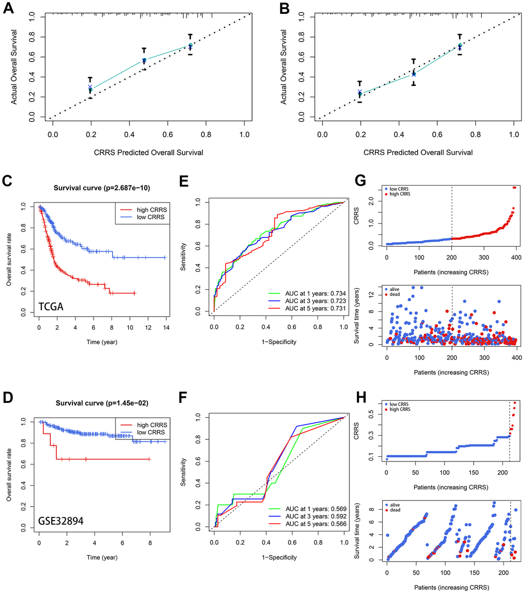 Diverse methods were conducted to validate the robustness of the CRRS in different independent cohorts, including TCGA-BLCA and GSE32894. The baseline clinical traits of these two cohorts are shown in Table 1. According to the established formula, the risk of these patients was evaluated, and the optimal cut-off was equal to 0.313, which is the median CRRS in the training dataset. The detailed information was supplemented in Supplementary Tables 7, 8. The 3- (Figure 3A) and 5-year (Figure 3B) Calibration plots indicated the predicted OS was similar to the ideal survival rates. Kaplan-Meier survival analyses showed the cases with high CRRS exhibited worse survival rates both in the TCGA-BLCA (P < 0.001, Figure 3C) and GSE32894 datasets (P < 0.05, Figure 3D). The receiver operating curves (ROC) of the 1-, 3-, and 5-year OS in the training dataset (Figure 3E) and external validation dataset (Figure 3F) verified the predictive value of the CRRS. Besides, more deaths were observed with the increasing CRRS (Figure 3G, 3H).