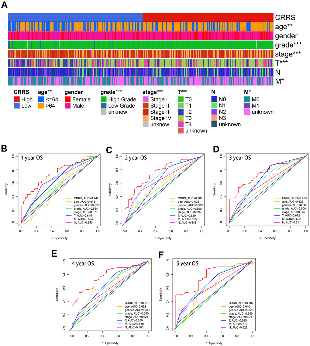 As displayed in Figure 4A, CRRS was significantly correlated with age (P < 0.01), tumor grade (P < 0.001), tumor stage (P < 0.001), pathological T stages (P < 0.001), and M stages (P < 0.05) via Chi-square test after excluding the cases with unknown statuses.