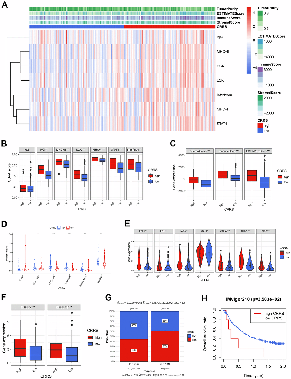 Given the high immune infiltration and unfavorable prognosis in the high-CRRS patients, we further explored the expression level of immune checkpoints and found that all the collected routine checkpoint genes exhibited significant expression differences (Figure 5E). The high expression level of the immune checkpoints might be responsible for the poor prognosis, implying that the cases with high CRRS were also sensitive to immunotherapy. Hence, some critical biomarkers indicating the immunotherapy efficacy, including CXCL9 [18], CXCL13 [18], and TIDE scores [19], were adopted to evaluate the immunotherapeutic sensitivity. Compared with the cases in the low-CRRS group, the patients in the high-CRRS group had higher expression levels of CXCL9 (P < 0.001) and CXCL13 (P < 0.001, Figure 5F). Th Chi-square test (P < 0.01, Figure 5G) displayed that the patients labelled with high CRRS would be more likely to benefit from the immunotherapy. CRRS could also serve as a prognosis biomarker for IMvigor210 cohort, who have received atezolizumab treatment (P < 0.05, Figure 5H). The calculated CRRSs of IMvigor210 cohort were shown in Supplementary Table 12.