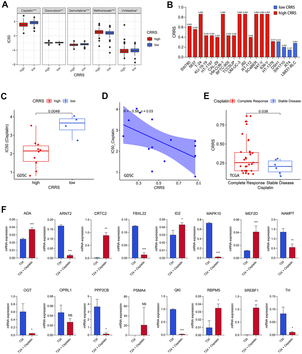 Based on the predicted half inhibitory concentration (IC50) of the patients from TCGA, we found the CRRS was significantly associated with the sensitivity of common chemotherapeutic agents, such as cisplatin (P < 0.001), doxorubicin (P < 0.01), gemcitabine (P < 0.001), methotrexate (P < 0.001), and vinblastine (P < 0.05, Figure 6A). Meanwhile, we downloaded the transcriptome expression values of 20 BCa cell lines and corresponding IC50 of the common chemotherapeutic drugs from Genomics of Drug Sensitivity in Cancer (GDSC, https://www.cancerrxgene.org/) database [20]. The CRRS of each cell line was evaluated, and the risk stratification was based on the median CRRS in the TCGA-BLCA cohort, which was mentioned above (Supplementary Table 13 and Figure 6B). We showed the cells with high CRRS exhibited a low IC50 of cisplatin (P < 0.01, Figure 6C), while no significance was achieved in doxorubicin (P > 0.05), gemcitabine (P > 0.05), methotrexate (P > 0.05), and vinblastine (P > 0.05, Supplementary Figure 5). The Spearman correlation analysis indicated the CRRS was tightly associated with the IC50 values (r = -0.58, P < 0.05, Figure 6D). The collected cisplatin response of TCGA-BLCA patients was also retrieved to serve as the clinical sample validation, and the cases reported to carry complete response to cisplatin have a significantly higher CRRS than the patients with stable disease (P < 0.05, Figure 6E).
