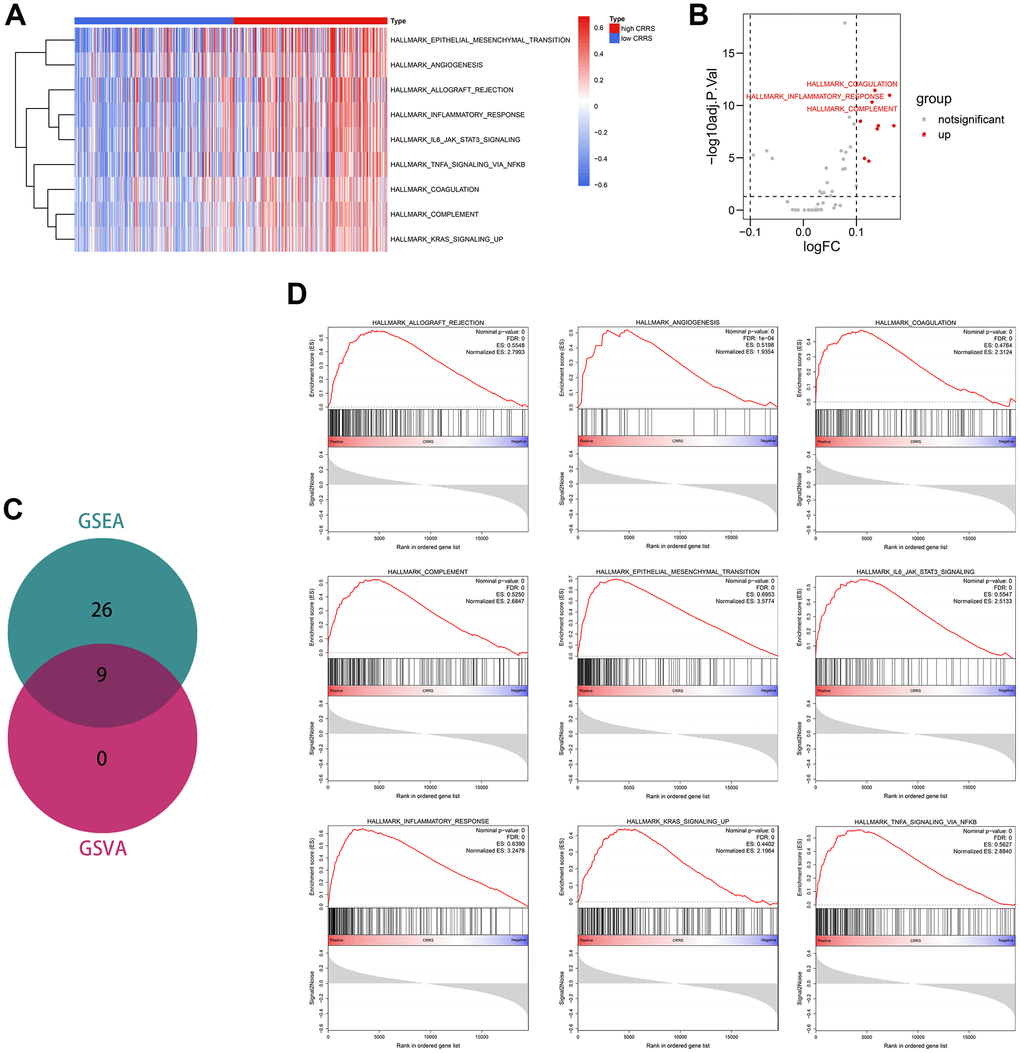 To detect the vital tumor phenotypes correlated with the CRRS, gene set enrichment analysis (GSEA) and GSVA were both performed. Through GSVA analysis, a sum of 9 hallmarks was identified, as shown in Supplementary Table 15 and Figure 7A, 7B. GSEA analysis screened 26 important tumor phenotypes, where the 9 hallmarks were also included (Supplementary Tables 16, 17 and Figure 7C). The details of the 9 overlapped hallmarks are illustrated in Figure 7D.