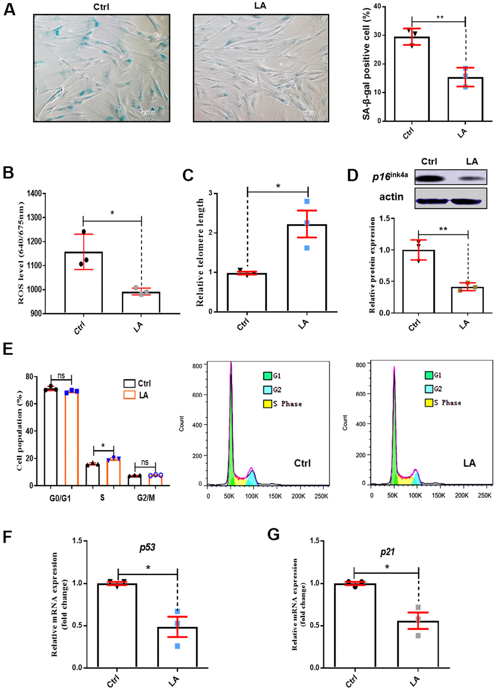 Cell cycle arrest results in genomic instability and premature aging [37], and delayed S phase progression contributes to genome instability [38]. Cell cycle analysis showed that LA (25 μmol) treatment caused a decrease in cells in G0/G1 phase and a significant increase in S phase cells (p<0.05) compared with Ctrl cells (Figure 1E).