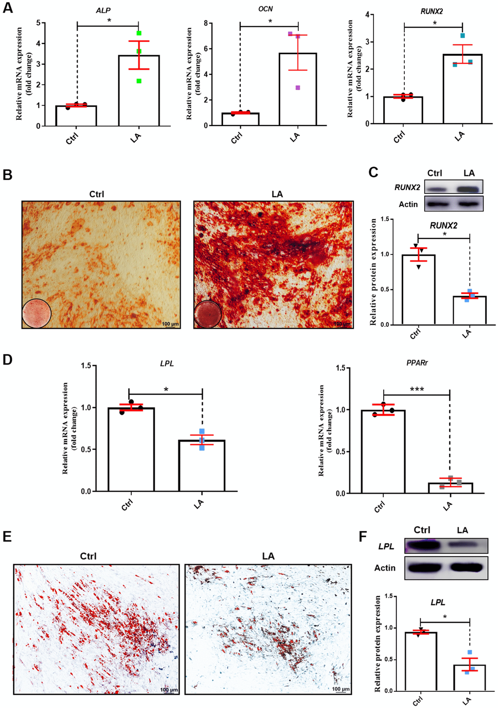 Briefly, cells were cultured in DMEM/F12 containing 25 μmol LA or Ctrl. At 70% confluence, cells were treated with OriCell™ differentiation media with 25 μmol LA maintained throughout the differentiation period. Alizarin Red staining was performed on day 25 for osteogenesis and Oil Red O staining on day 14 for adipogenesis. Images were obtained by microscopy.