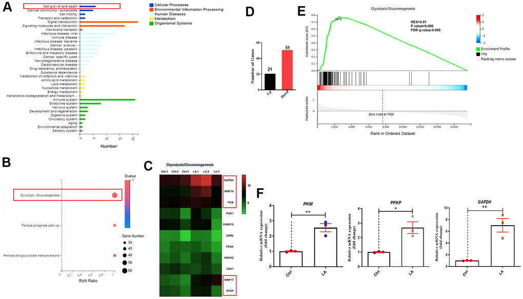 On the basis of RNA-seq to analyze the specific mechanism, a classification map of KEGG pathway analysis revealed that 4 signaling pathways related to cell growth and death were regulated by LA (25 μmol) (Figure 3A). Furthermore, a bubble diagram showed that glycolysis/gluconeogenesis signaling pathways were regulated by LA (Figure 3B) and a heatmap showed differentially expressed genes related to glycolysis/gluconeogenesis signaling pathways (Figure 3C). Heatmap analysis showed that the expressions of GAPDH, MMP14, PKM, MMP17, and PFKP genes, which are related to the glycolysis/gluconeogenesis signaling pathway, were upregulated in the LA group compared with the Ctrl group. Examination of differentially expressed genes revealed 21 upregulated genes and 51 downregulated genes in the LA -treated group compared with the Ctrl group (Figure 3D). Furthermore, gene set enrichment analysis (GSEA) of the differentially expressed genes revealed that LA treatment activated the glycolysis/gluconeogenesis signaling pathways (Figure 3E).