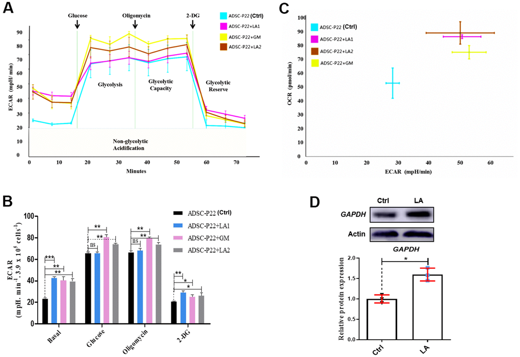 Following LA treatment of hADSCs, glucose consumption was increased (Figure 4A). ECAR in hADSCs at each phase in the glycolysis pathway showed that basal, glucose, oligomycin, and 2-DG (2-Deoxy-D-glucose, one of the glycolysis inhibitors) phases were significantly higher in LA1 and LA2 groups than in the Ctrl (P<0.01) (Figure 4B). Additionally, when treated with LA (25 μmol), the relationship between ECAR and OCR showed a positive correlation and was higher than in the Ctrl (Figure 4C). Glycolysis levels showed that LA activated the glycolysis pathway by significantly improving ECAR and OCR in aged hADSCs compared with the Ctrl. Previous RNA-seq data suggested that LA can increases the expression of GAPDH, a critical regulation enzyme in the glycolysis pathway, and the upregulation of GAPDH expression can activate glycolysis progression [48]. Western blot analysis showed that GAPDH protein level was increased in hADSCs treated with LA (p<0.05) compared with the Ctrl (Figure 4D).