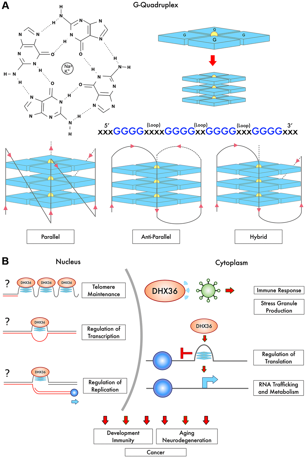 DHX36 (also known as RHAU and G4R1), a highly conserved member of the DExD/H box helicase family, binds with and unfolds G4s, thereby changing how G4 structures influence DNA- and RNA-dependent processes. DHX36, a major G4 helicase, unwinds both G4 DNA and G4 RNA, and understanding the impact on both structures makes it an interesting research target, considering the role of G4s in a variety of processes [8]. Recent reviews on the subject extensively described DHX36’s structure and how DHX36 functions in cells [9, 10]. In this minireview, we provide a brief overview of G4/DHX36 interaction and a brief summary of recent discoveries in the field with emphasis given to DHX36’s role in cancer, telomere maintenance, and viral infection. We then discuss the role of DHX36 in neurodegenerative diseases and brain aging and highlight possible future directions for research in these areas.