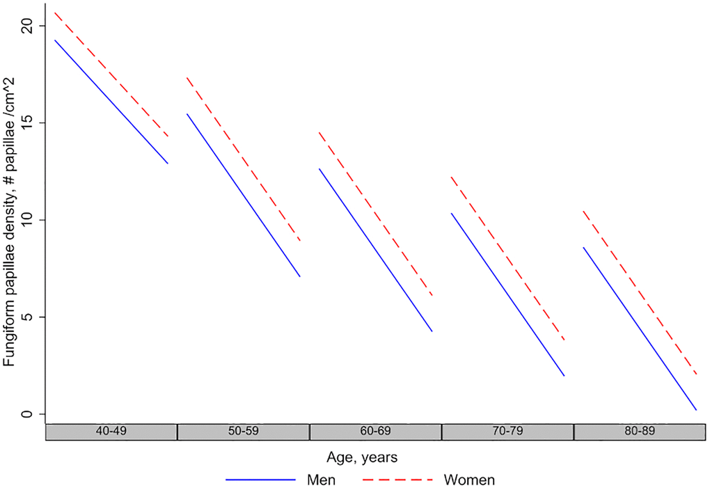 We studied fungiform papillae density in men and women from the Baltimore Longitudinal Study of Aging (BLSA) with the aims to: (1) delineate longitudinal patterns of change of fungiform papillae density; (2) explore sex and racial differences in the rate of change; and (3) identify other possible determinants of the rate of longitudinal changes in fungiform papillae density.