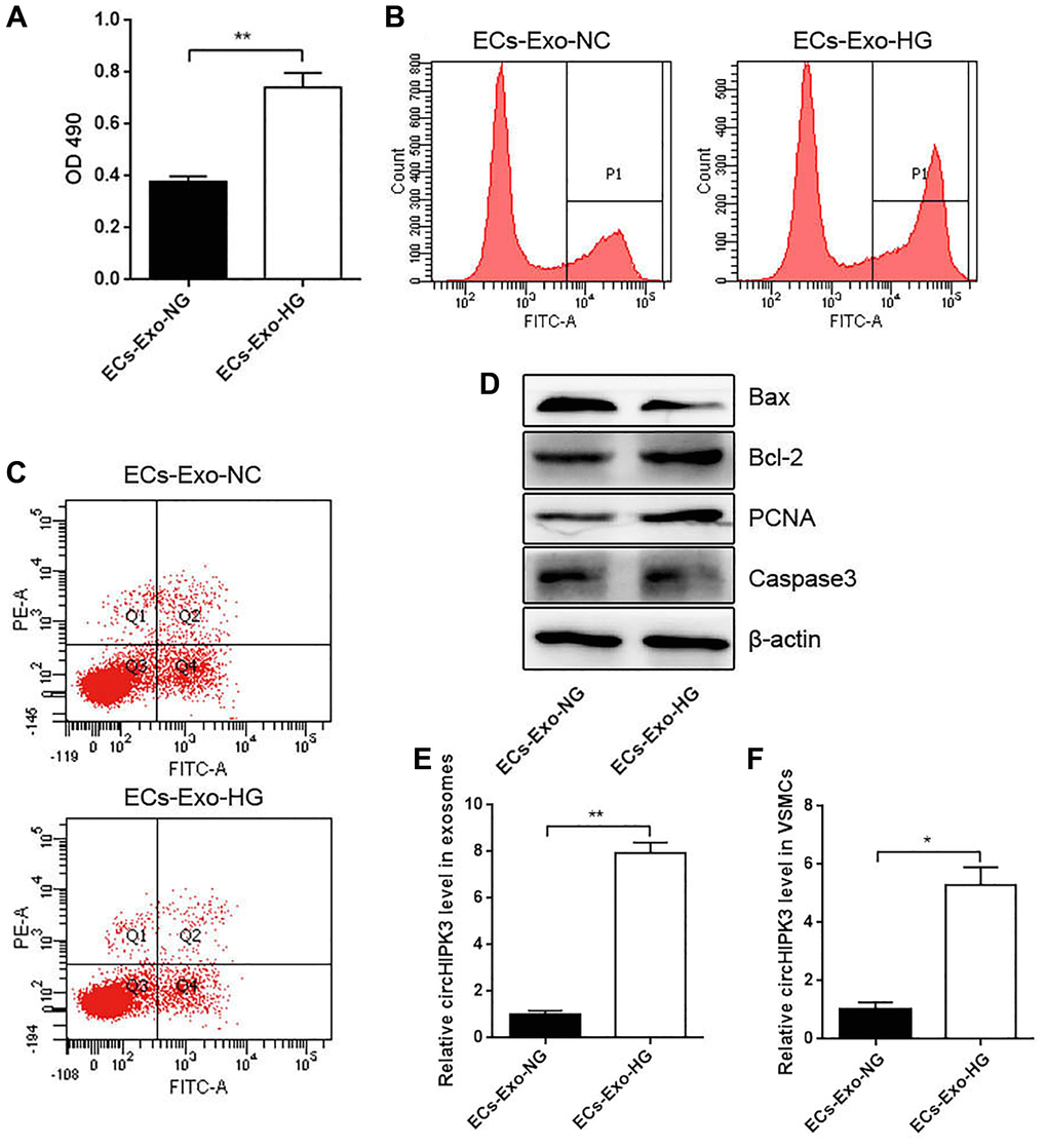 To understand the crosstalk between MAECs and VSMCs in HG conditions, we incubated VSMCs with exosomes isolated from a normal MAEC medium (ECs-Exo-NG; 5.5 mM) or an HG medium (ECs-Exo-HG; 25 mM) for 24 h and performed CCK-8 and 5-ethynyl-2' -deoxyuridine (EdU) assays. VSMCs incubated with ECs-Exo-HG showed markedly increased viability compared with ECs-Exo-NG (Figure 2A and 2B). Flow cytometry (FCM) analysis showed that VSMCs incubated with ECs-Exo-HG exhibited decreased apoptosis compared with ECs-Exo-NG after inducing apoptosis by H2O2 (Figure 2C). Western blot analysis showed that the expressions of Proliferating Cell Nuclear Antigen (PCNA) and Bcl2 were increased and those of Caspase 3 and Bax were decreased in VSMCs incubated with ECs-Exo-HG compared with those incubated with ECs-Exo-NG (Figure 2D). These results indicated that exosomes derived from ECs promoted proliferation and inhibited apoptosis in VSMCs. To explore the underlying molecular mechanism of this phenomenon, we also isolated exosomes from the MAEC culture medium and found that the level of circHIPK3 increased in the ECs-Exo-HG group compared with the ECs-Exo-NG group (Figure 2E). In addition, the level of circHIPK3 increased significantly in VSMCs incubated with ECs-Exo-HG compared with those incubated with ECs-Exo-NG (Figure 2F).