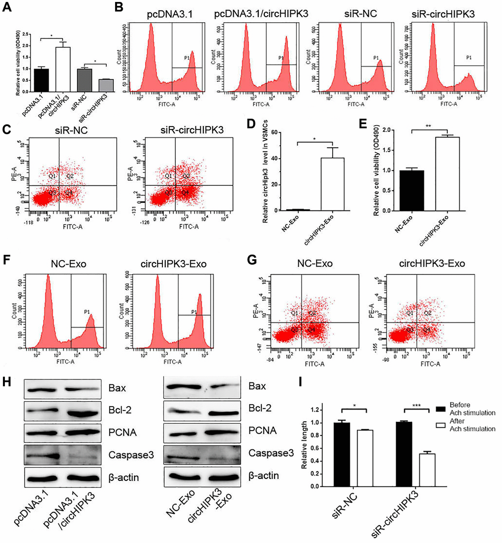 Given that exosomes derived from ECs change the phenotype of VSMCs and alter the expression of circHIPK3 in VSMCs, we focused on exosomal circHIPK3 derived from ECs on the phenotype of VSMCs. CCK-8 and EdU assays were performed after overexpressing or knocking down circHIPK3. The results showed that circHIPK3 overexpression and knockdown promoted and inhibited the cell viability of VSMCs, respectively (Figure 3A and 3B). FCM analysis showed that siR-circHIPK3 could promote the apoptosis of VSMCs (Figure 3C). We also transfected pcDNA3.1/circHIPK3 (circHIPK3-Exo) or pcDNA3.1 (NC-Exo) in 293A cells and isolated exosomes to incubate VSMCs. The Real-Time Quantitative Reverse Transcription PCR (qRT-PCR) results showed that the circHIPK3 level increased in the circHIPK3-Exo group compared with that in the NC-Exo group in VSMCs (Figure 3D). CCK-8 and EdU assays showed that the cell viability of VSMCs increased in the circHIPK3-Exo group compared with that in the NC-Exo group (Figure 3E and 3F). By contrast, FCM showed decreased apoptosis in VSMCs incubated with circHIPK3-Exo compared with NC-Exo after inducing apoptosis by H2O2 (Figure 3G). Nevertheless, western blot analysis showed that the expressions of PCNA and Bcl2 increased in VSMCs transfected with pcDNA3.1/circHIPK3 or incubated with circHIPK3-Exo compared with those of the control group. The expression of Bax and Caspase 3 decreased in the pcDNA3.1/circHIPK3 group and circHIPK3-Exo group (Figure 3H). Considering that VSMCs regulate vessel tone and blood pressure by contraction and relaxation, we examined the effect of circHIPK3 on VSMC contraction induced by acetylcholine (Ach). The results showed that circHIPK3 knockdown promoted Ach-induced VSMC contraction (Figure 3I).