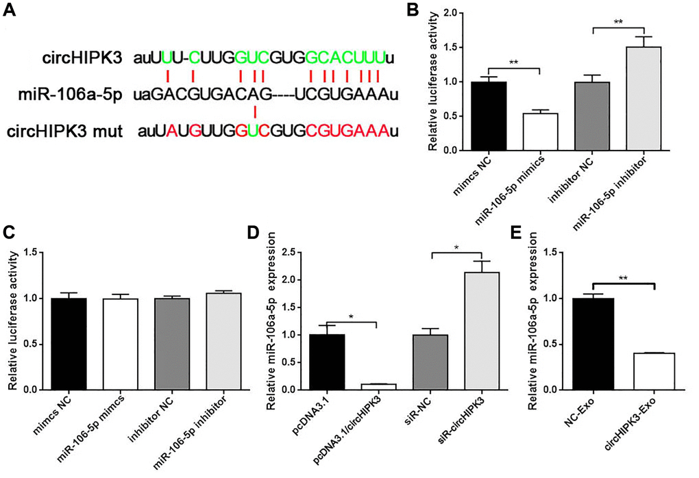 To further evaluate the underlying molecular mechanism of circHIPK3 on the VSMC phenotype, we used StarBase to predict the binding sites of miRNAs in the whole circHIPK3 sequence. We found that circHIPK3 contained sequences complementary to miR-106a (Figure 4A). We constructed luciferase plasmid (pmirGLO/circHIPK3 wt) and co-transfected pmirGLO/circHIPK3 wt with miR-106a-5p mimics or miR-106a-5p inhibitor into 293A cells. The results showed that when pmirGLO/circHIPK3 was co-transfected with miR-106a-5p mimics, the luciferase activity decreased compared with that of the control group. Once pmirGLO/circHIPK3 was co-transfected with miR-106a-5p inhibitor, the luciferase activity increased (Figure 4B). Moreover, we also constructed the mutation plasmid (pmirGLO/circHIPK3 mut) that contained the mutation sites of the binding sites between them. No effects on luciferase activity were observed when cells were co-transfected with pmirGLO/circHIPK3 mut along with miR-106a-5p mimics or miR-106a-5p inhibitor (Figure 4C). qRT-PCR was performed to evaluate the regulation between circHIPK3 and miR-106a-5p. Our results showed that circHIPK3 led to a decrease in miR-106a-5p expression (Figure 4D). CircHIPK3-Exo inhibited miR-106a-5p expression compared to NC-Exo (Figure 4E). These results revealed that exosomal circHIPK3 could bind miR-106a-5p and regulate its expression in vitro.