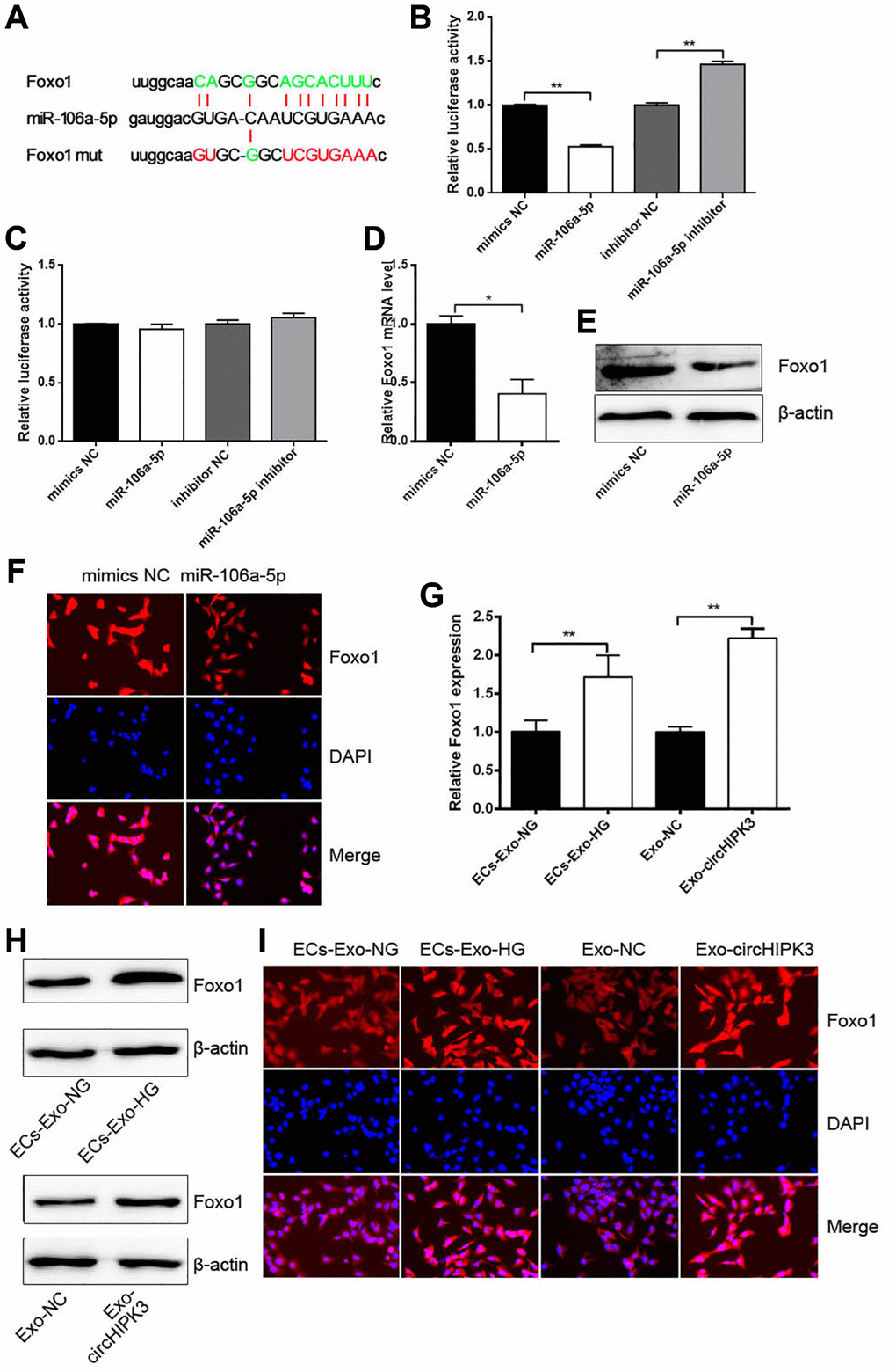 Given that miRNAs regulate mRNA expression by binding to the 3′UTR section of mRNAs, we predicted that Foxo1 3′UTR had the binding sites of miR-106a-5p (Figure 5A). Dual luciferase assay was performed, and the results showed that luciferase activity was reduced when 293A cells were co-transfected with miR-106a-5p mimics and pmirGLO/Foxo1 3′UTR wt compared with when 293A cells were co-transfected with mimics NC and pmirGLO/Foxo1 3′UTR wt. Luciferase activity was increased when cells were co-transfected with miR-106a-5p inhibitor and pmirGLO/Foxo1 3′UTR wt (Figure 5B). No changes were observed when 293A cells were co-transfected with miR-106a-5p mimics or miR-106a-5p inhibitor and pmirGLO/Foxo1 3′UTR mut compared with their corresponding control group (Figure 5C). qRT-PCR, western blot analysis, and Immunofluorescence (IF) revealed that the overexpression of miR-106a-5p decreased Foxo1 mRNA and protein levels (Figure 5D–5F). Nevertheless, VSMCs incubated with ECs-Exo-HG or Exo-circHIPK3 promoted Foxo1 mRNA and protein expressions compared with their corresponding control (Figure 5G–5I). These results indicated that circHIPK3 promoted Foxo1 expression via sponging miR-106a-5p in VSMCs.