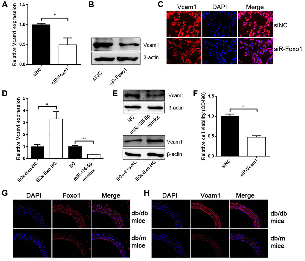 Previous studies revealed that Foxo1 could promote Vcam1 expression as a transcription factor. The results obtained from qRT-PCR, western blot analysis, and IF found that Foxo1 knockdown inhibited Vcam1 expression (Figure 7A–7C). ECs-Exo-HG promoted Vcam1 mRNA and protein levels compared with their negative control (Figure 7D and 7E). miR-106a-5p overexpression inhibited Vcam1 expression (Figure 7D and 7E). CCK-8 assay showed that Vcam1 knockdown could inhibit VSMC proliferation (Figure 7F). In addition, we used db/db mice and the control db/m mice. As expected, IF for Foxo1 and Vcam1 revealed that Foxo1 and Vcam1 expressions were significantly increased in the aorta of db/db mice compared with the control db/m mice (Figure 7G and 7H).