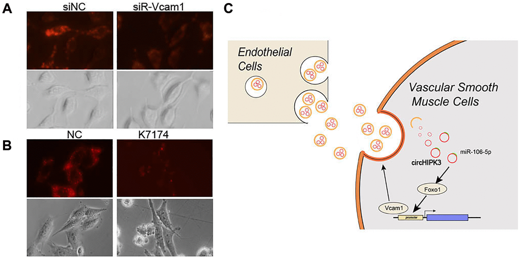 Exosome uptake partly occurs via adhesion factors, including Vcam1, which induces fusion and endocytosis. Subsequently, we aimed to study whether EC-derived exosome uptake was depended on Vcam1-mediated endocytosis. We used DiO-labeled exosomes to analyze the uptake of exosomes, which decreased when Vcam1 expression was knocked down by siRNA (Figure 8A). K-7174, which is a Vcam1 inhibitor, could also block the uptake of exosomes (Figure 8B). These results indicated that the uptake of EC-derived exosomal circHIPK3 by VSMCs partly depends on Vcam1-mediated endocytosis.