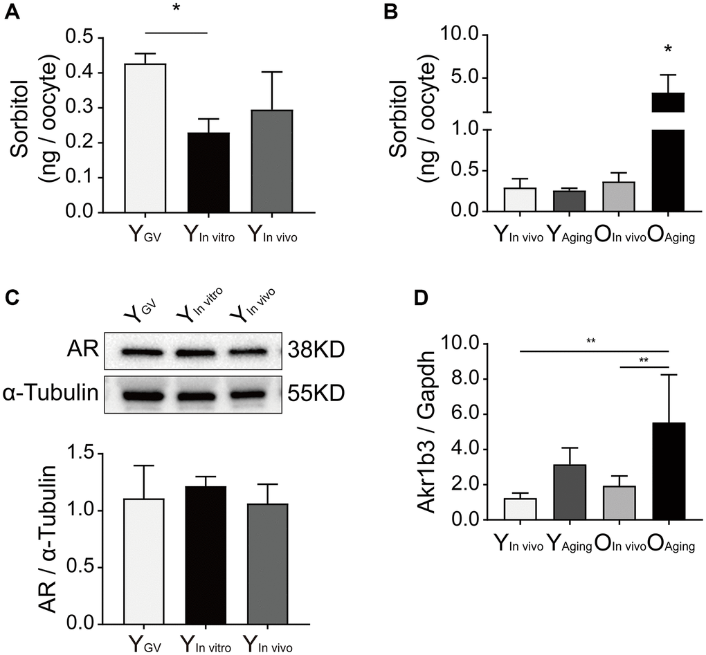 The levels of sorbitol in oocytes were measured by HPLC/MS/MS. The sorbitol levels were significantly lower in the in vitro-matured oocytes of young mice than in germinal vesicle (GV)-stage oocytes (Y GV: 0.43 ± 0.03 vs. Y In vitro: 0.23 ± 0.04 vs. Y In vivo 0.30 ± 0.11 ng/oocyte, n = 3, P < 0.05; Figure 1A). Interestingly, the sorbitol levels in the oocytes of aged mice were significantly increased after in vitro aging (O aging: 3.31 ± 2.05 vs. O in vivo: 0.37 ± 0.11 vs. Y aging: 0.26 ± 0.03 vs. Y in vivo: 0.30 ± 0.11 ng/oocyte, n = 3, P < 0.05; Figure 1B). AR is the key enzyme associated with intracellular sorbitol production in the polyol pathway, and the Akr1b3 gene encodes AR. There were no significant differences in the expression of AR in the oocytes of young mice (P > 0.05; Figure 1C). However, the relative expression of Akr1b3 was significantly increased in aged oocytes after in vitro aging (Akr1b3/Gapdh: O aging: 5.55 ± 2.71 vs. O in vivo: 1.95 ± 0.55 vs. Y aging: 3.16 ± 0.93 vs. Y in vivo: 1.24 ± 0.29, P < 0.01; Figure 1D).