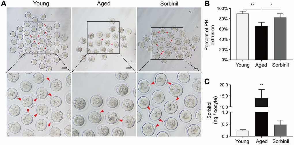 This study was designed to explore whether the polyol pathway is activated in aged oocytes and to elucidate the effects of increased sorbitol on the IVM procedure and quality of in vitro-matured oocytes. To understand the potential mechanism, the levels of oxidative stress and AR were tested. Our results suggest that inhibition of sorbitol production can improve the maturation rate of oocytes in aged mice during IVM and that the oxidative stress induced by sorbitol is a potential mechanism by which the polyol pathway affects oocyte maturation.