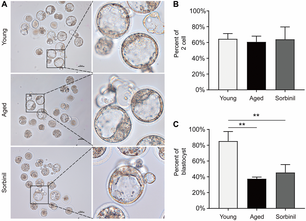 Oocyte maturation was evaluated by observing the first polar body extrusion (PBE); specifically, the percentage of oocytes with PBE was used to reflect oocyte nuclear maturation. The maturation rate of oocytes undergoing IVM of aged mice (9 months old) was significantly lower than that of young mice (8 weeks old) (66.1% ± 6.9% vs. 90.1% ± 4.6%, n = 3, P < 0.01; Figure 2A and 2B). The sorbitol levels in the oocytes of aged mice were significantly higher than those in the oocytes of young mice (14.08 ± 3.78 vs. 0.23 ± 0.04 ng/oocyte, n = 3, P < 0.01; Figure 2C). Sorbinil, a specific inhibitor of AR, was used to inhibit the production of intracellular sorbitol. The sorbitol levels in the IVM oocytes of aged mice were significantly decreased when 200 μM sorbinil was used in the IVM medium (14.08 ± 3.78 vs. 0.48 ± 0.19 ng/oocyte, n = 3, P < 0.01; Figure 2C), and the maturation rate of oocytes undergoing IVM was increased upon sorbinil supplementation (82.4% ± 7.2% vs. 66.1% ± 6.9%, n = 3, P < 0.05; Figure 2B). COCs were cultured for 16–18 h in IVM medium, and the expanded COCs were collected for IVF. Fertilization and blastocyst formation were then observed, and there were no significant differences in the percentages of 2-cell embryos (%) among the young, aged and sorbinil treatment groups (64.6% ± 6.7%, 60.8% ± 7.3%, and 64.0% ± 15.7%, n = 3, P > 0.05; Figure 3A and 3B). The rate of blastocyst formation in the young group was significantly higher than that in the aged groups (85.3% ± 12.0% vs. 37.6% ± 2.1%, n = 3, P < 0.01; Figure 3C). The rate of blastocyst formation was partially rescued by sorbinil in aged oocytes. However, there was no difference between the aged group and the sorbinil group (37.6% ± 2.1% vs. 45.4% ± 10.1%, n = 3, P > 0.05; Figure 3C).