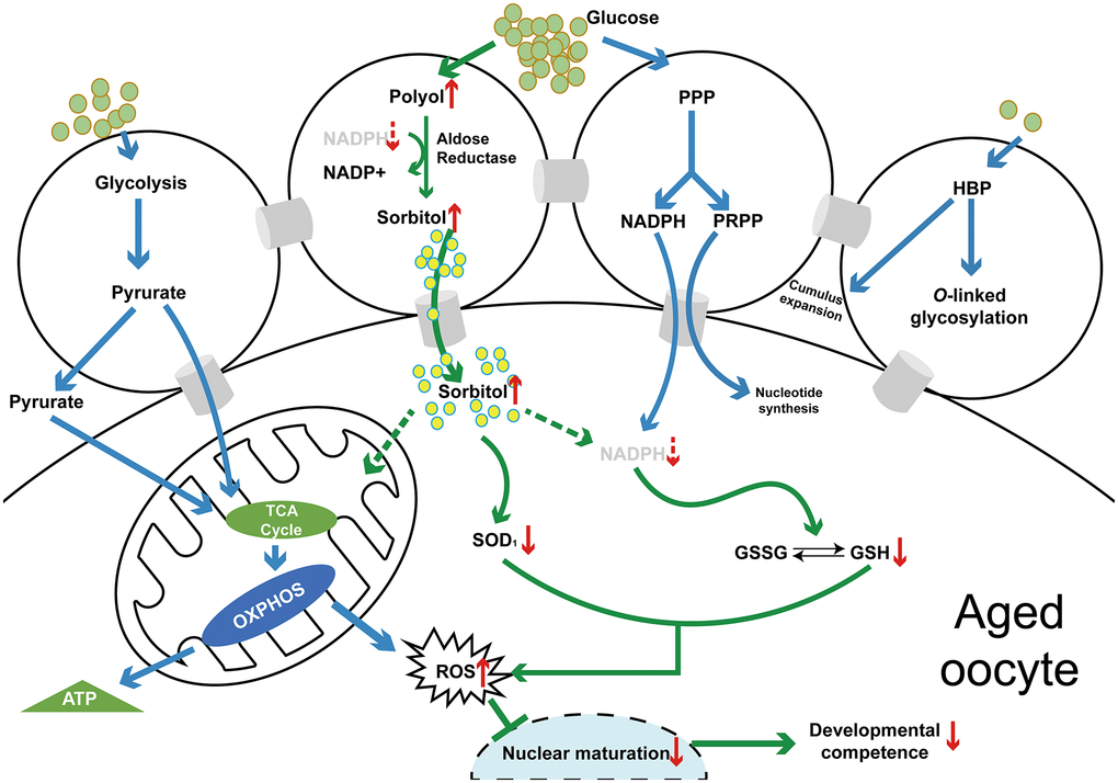 Oocyte maturation requires an enormous amount of energy to synchronize nuclear and cytoplasmic maturation. Glucose is the major energy source during oocyte development and maturation, but energy is also provided by the cellular metabolism of lipids and proteins [16]. Four glucose metabolic pathways are found in the cumulus-oocyte complex (COC): glycolysis, the pentose phosphate pathway (PPP), the hexosamine biosynthesis pathway (HBP) and the polyol pathway [17]. The main glucose metabolic pathways of COCs are glycolysis and the PPP, which provide metabolites such as pyruvate and nicotinamide adenine dinucleotide phosphate reduced form (NADPH) that can be transferred to oocytes for utilization through gap junctions [18]. The most important mechanisms of ATP production in oocytes are the mitochondrial tricarboxylic acid cycle (TCA) and electron transfer; pyruvate for these processes comes from the cumulus cells surrounding oocytes. The polyol pathway can convert glucose to sorbitol via aldose reductase (AR) and can oxidize sorbitol to fructose through sorbitol dehydrogenase (SDH) [19]. However, since AR has a lower affinity for glucose than other enzymes, such as hexokinase, the polyol pathway accounts for a small percentage of glucose metabolism under normal glycemic conditions. Nevertheless, the polyol pathway is activated in a hyperglycemic environment as a result of saturation of the enzyme hexokinase [20]. Previous studies have indicated that NADPH consumption, sorbitol accumulation, and fructose and NADH generation play important roles in the etiology and complications of diabetes [21]. Recent studies have also shown that supplementation with sorbitol in IVM medium can restrain porcine oocyte maturation and subsequent embryo development by decreasing glutathione reduced form (GSH) levels and increasing reactive oxygen species (ROS) levels which indicated that sorbitol accumulation in cells is closely related to oxidative stress [22]. However, the precise roles of the polyol pathway in oocyte maturation and embryo development, especially in aged or aging oocytes, are not clear.