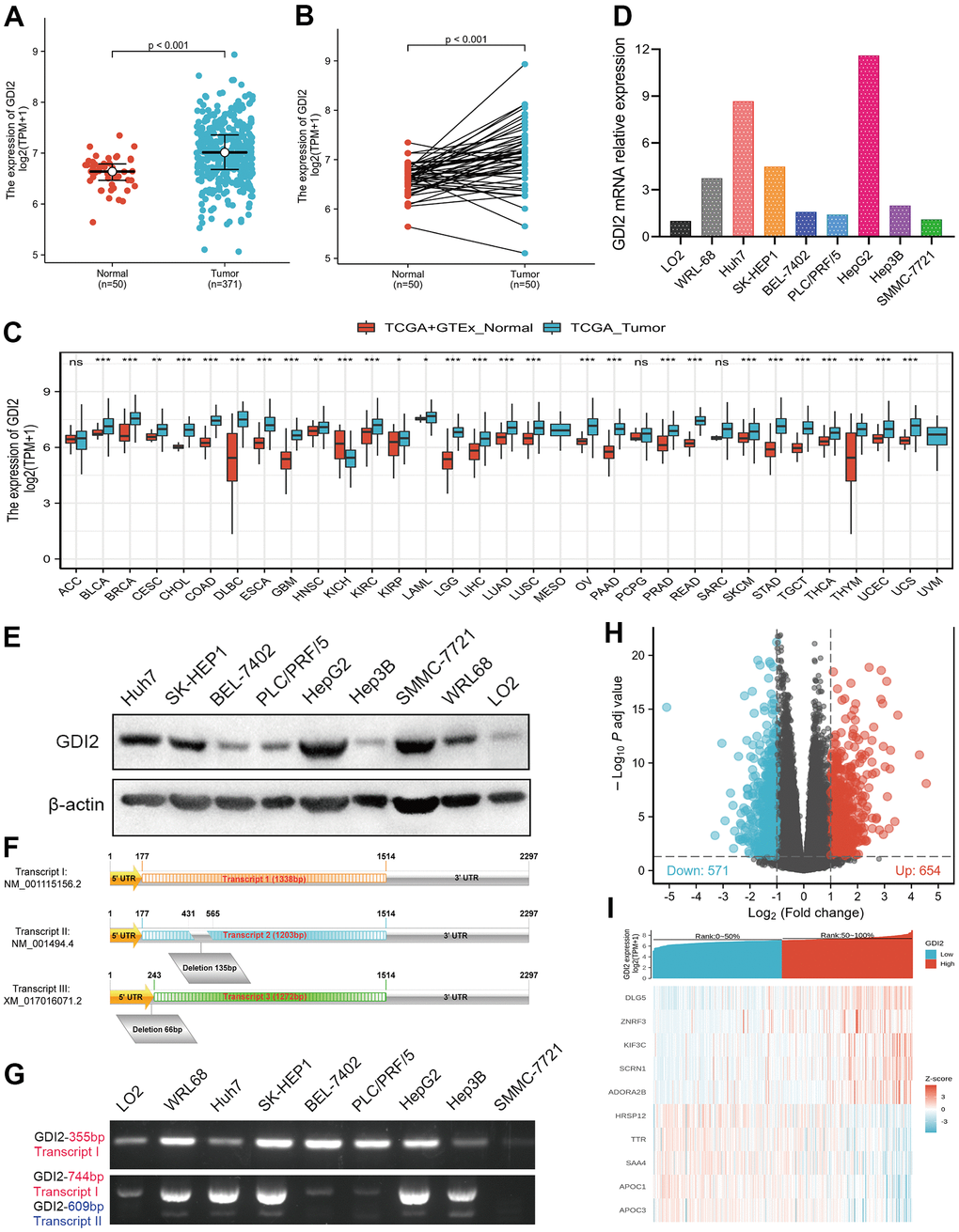 To elucidate whether GDI2 was positively correlated with HCC occurrence, the GDI2 expressions were compared between 371 HCC cases and 50 normal tissue cases via RNAseq TMP data from TCGA combined with GTEx, which showed much higher expression of GDI2 in tumor cases than in normal cases (P < 0.001, Figure 1A). Among them, 50 tumor-and-adjacent paired samples were also showed high expression of GDI2 in tumor compared with paired normal tissues (P < 0.001, Figure 1B). To further define the oncogenicity of GDI2, comparison of GDI2 expression between tumor and normal specimens was also made in pan-cancers from TCGA-GTEx database. It was shown that GDI2 significantly expressed in most of the 33 kinds of solid tumors, such as hepatocellular carcinoma (LIHC, HCC), lung adenocarcinoma (LUAD), cholangiocarcinoma (CHOL), breast cancer (BRCA), glioblastoma (GBM), endometrial carcinoma of uterus (UCEC), etc (Figure 1C). Then the differential expression of GDI2 was verified between two normal hepatic cell lines (L02, WRL-68) and seven hepatoma cell lines (Huh7, SK-HEP1, BEL-7402, PLC/PRF/5, SMMC-7721, HepG2, Hep3B) in vitro. Moreover, which transcript exerts effect in these HCC cell lines was also confirmed by designing different primers amplifying certain fragments for different transcripts of GDI2 gene. Both qRT-PCR and western blot assays confirmed that compared with normal hepatic cells L02, GDI2 expression was increased in most of hepatoma cells (Figure 1D, 1E). Although there are three transcripts GDI2 mRNA, Transcript I (NM_001115156.2) and Transcript II (NM_001494.4) are two confirmed mature transcripts, while Transcript III (XM_017016071.2) is a predictive transcript overlapped with Transcript I only with a latter Start Codon (Figure 1F). Correspondingly, PCR amplification displayed that almost both Transcript I and II of GDI2 gene contributed to GDI2 expression in HCC cell lines (Figure 1G). Finally, based on the cut-off criteria (|log2-fold change (FC)|>1, adjusted P-value<0.05) for median value of GDI2 expression, a total of 1225 Differentially Expressed Genes (DEGs) were identified after the analyses of TCGA RNA-seq data between GDI2-high and -low groups, including 654 upregulated and 571 downregulated DEGs illustrated by Volcano Map (Figure 1H), 10 of which were specifically displayed by Heat Map (Figure 1I).