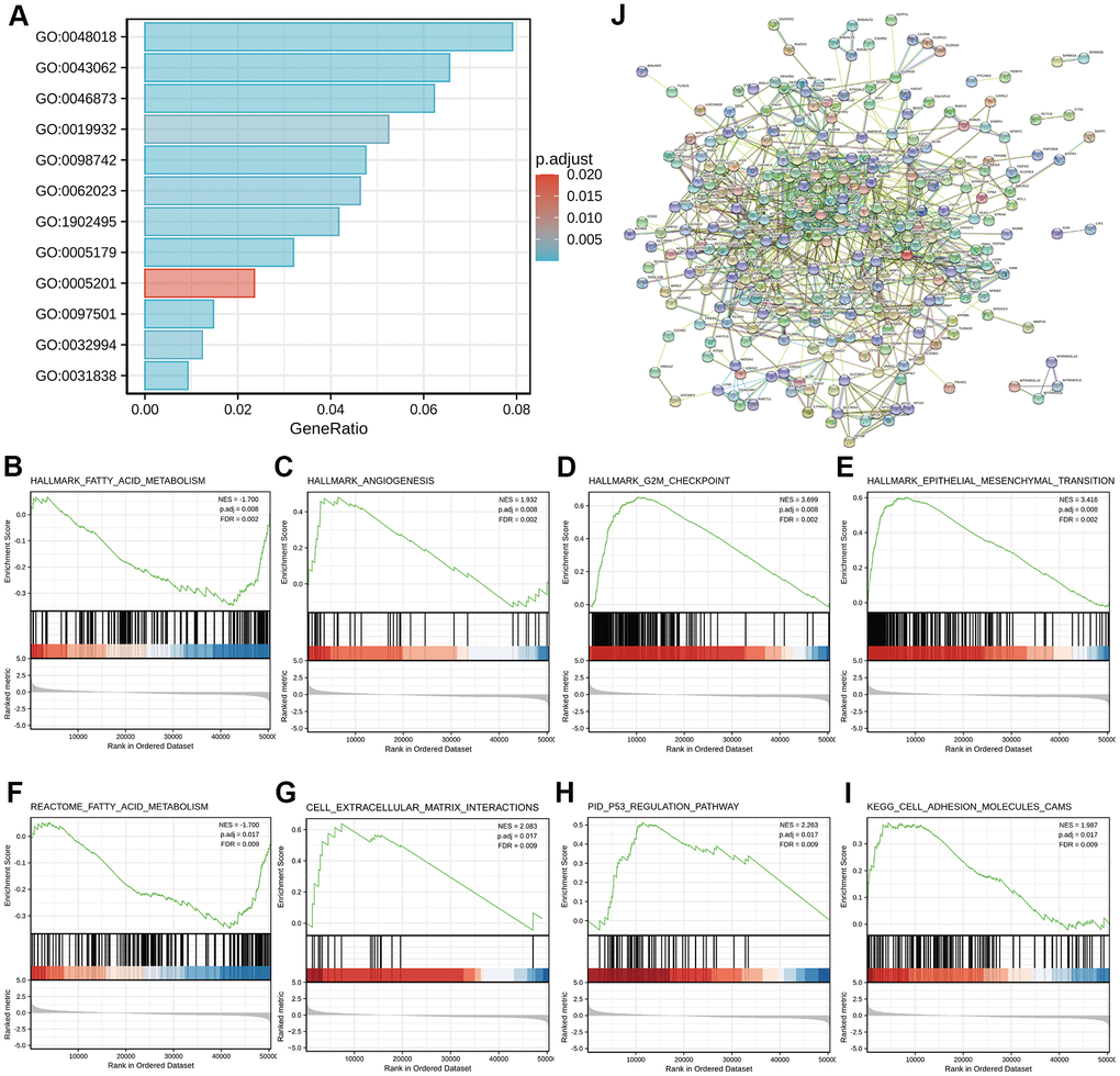As for advanced analysis, gene set enrichment analysis (GSEA) was applied to confirm the key signaling pathways referring to GDI2 expression data sets. Significant differences with normalized enrichment score |NES| > 1.0, adjusted P-value < 0.05, false discovery rate (FDR) < 0.25 in enrichment of the MSigDB Collection h.all.v7.0.symbols [Hallmarks] and c2.cp.v7.0.symbols [curated] were observed in a total of 39 and 690 pathways, respectively. In particular, GDI2 was related to the Fatty acid metabolism, Angiogenesis, G2M checkpoint, Epithelial mesenchymal transition of Hallmarks symbols (adj.P = 0.008, FDR = 0.002; Figure 2B–2E), and similarly, to the Fatty acid metabolism by REACTOME, Cell extracellular matrix interactions by REACTOME, P53 regulation pathway by PID, Cell adhesion molecules CAMS by KEGG of C2_curated symbols (adj. P = 0.017, FDR = 0.009; Figure 2F–2I).