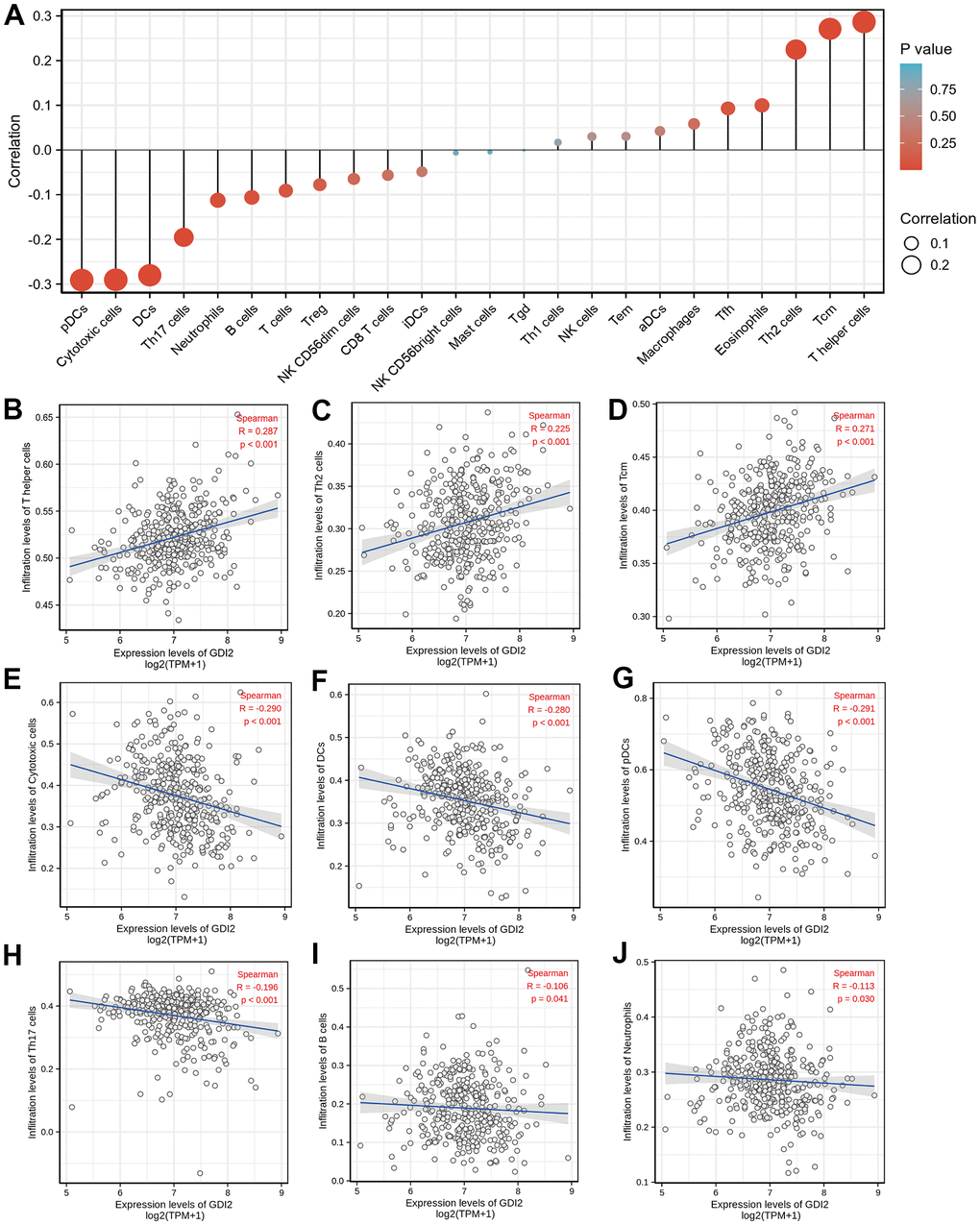 The following 24 types of immune cells were obtained: B cells; T cells, Helper T cells (Th), Cytotoxic T cells (Tc), CD4+ T cells, CD8+ T cells, type-1 T helper cells (Th1), type-2 T helper cells (Th2), type-17 T helper cells (Th17), Regulatory T cells (Treg), gamma delta T cells (γδT), central memory T cells (Tcm), effector memory T cells(Tem), follicular helper T cells(Tfh); Dendritic cells (DCs), activated Dendritic cells (aDCs), immature Dendritic cells (iDCs), plasmacytoid Dendritic cells (pDCs); natural killer (NK) cells, CD56 bright natural killer cellsr (CD56+NK), CD56 dim natural killer cells (CD56-NK); eosinophils, mast cells, neutrophils and macrophages. The correlation between GDI2 and these immune cells was analyzed by Spearman correlation, and Wilcoxon rank sum test was adopted to explore the association of the infiltration levels of immune cells between the high- and low- expression groups of GDI2 gene.