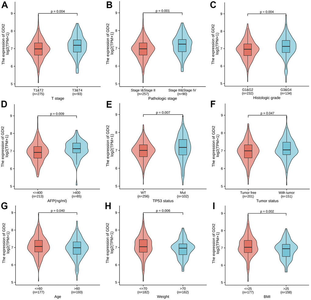 Wilcoxon rank sum test and t. test were utilized to evaluate the clinical index (age, gender, weight, BMI, AFP(ng/ml), etc.) in non-paired samples and paired samples with different expression levels of GDI2 (the Fisher exact test was used when needed) [48]. The association of GDI2 expression with clinicopathological features, such as TNM stage (TNM stage is a way of staging tumors, in which T represents the range of primary tumors, N represents the presence and extent of regional lymph node metastasis and its scope, M represents the presence or absence of a distant transfer), pathologic stage, histologic grade, and TP53 status, was evaluated by Chi-square test, and Logistics regression was performed on both continuous TPM values and high- and low-classifications of GDI2 expression.