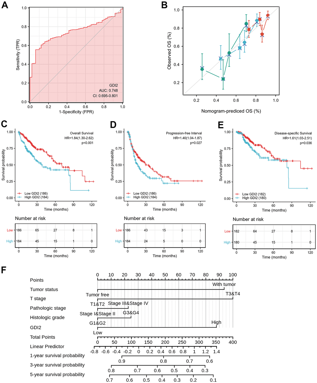 Next, the Kaplan-Meier survival analysis was performed in 184 HCC patients with GDI2-high expression and 186 cases with GDI2-low expression to evaluate the relationship between GDI2 expression and survival status of HCC patients in TCGA cohort. It showed that high GDI2 expression was strongly associated with a worse overall survival (OS) (P < 0.001, HR (95%CI) = 1.84 (1.30-2.62); Figure 5C), a worse progression-free interval (PFI) (P=0.027, HR (95%CI) = 1.40 (1.04-1.87); Figure 5D), as well as a worse disease-specific survival (DSS) (P = 0.036, HR (95%CI) = 1.61 (1.03-2.51); Figure 5E) than that of low GDI2 expression. In survival prediction nomogram for OS, the calibration curve conformed well to observations in all patients, integrating GDI2 and tumor status index, as well as T stage, pathologic stage and histologic grade with a Hosmer-Lemeshow test, implied no departure from perfect fit (Figure 5F). These validations suggested that the models based on GDI2 expression were effective for predicting short-term or long-term survival in HCC patients.