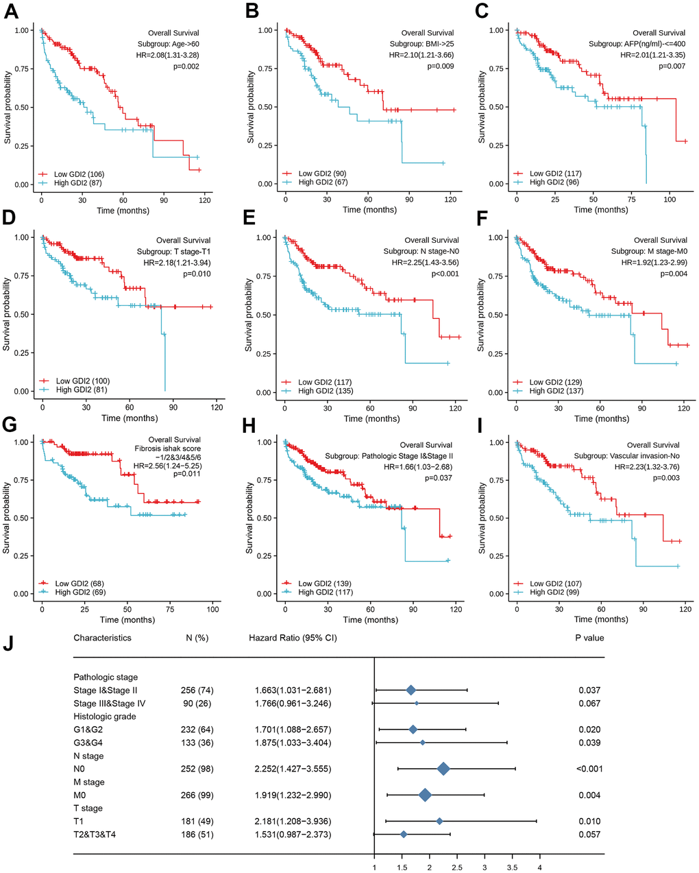 As for the subtypes of clinicopathological features associated with prognosis, the K-M survival analysis for sub-population displayed that GDI2 expression significantly impacted the OS rate in HCC patients with certain clinical index as: Age>60 (HR=2.08(1.31-3.28); P = 0.002; Figure 6A), BMI>25 (HR=2.10(1.21-3.66); P = 0.009; Figure 6B), and AFP(ng/ml)<=400 (HR=2.01(1.21-3.35); P = 0.007; Figure 6C). Meanwhile, HCC patients with low GDI2 expression could improve their prognosis when they were with clinicopathological subtypes as: T1 Stage (N=49, P = 0.010; HR (95%CI) = 2.18 (1.21-3.94); Figure 6D), negative lymph nodes (N=252, P < 0.001; HR (95%CI) = 2.252 (1.427-3.555); Figure 6E), without metastasis (N=266, P = 0.004; HR (95%CI) = 1.919 (1.232-2.990); Figure 6F), with fibrosis ishak score-1/2&3/4&5/6 (HR=2.56(1.24-5.25); P=0.011; Figure 6G); early pathologic stage I&II (HR=1.66(1.03-2.68); P=0.037; Figure 6H), and no vascular invasion (HR=2.23(1.32-3.76); P=0.003; Figure 6I). Then significant subtypes with prognostic impact were together intuitively illustrated by Forest Map (Figure 6J). These results suggested that GDI2 could be applied as a prognostic indicator in early stage of HCC.