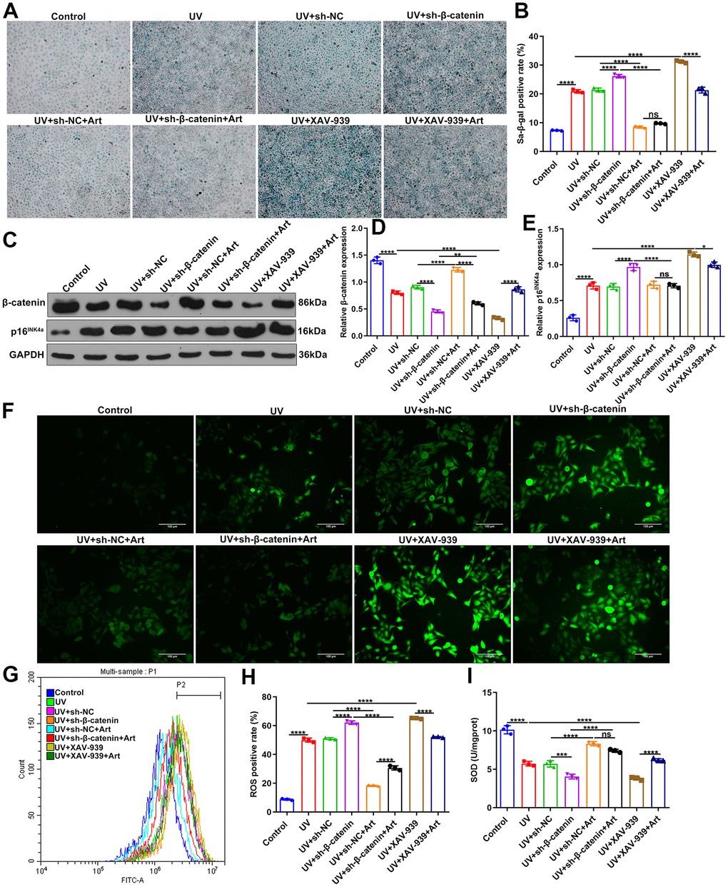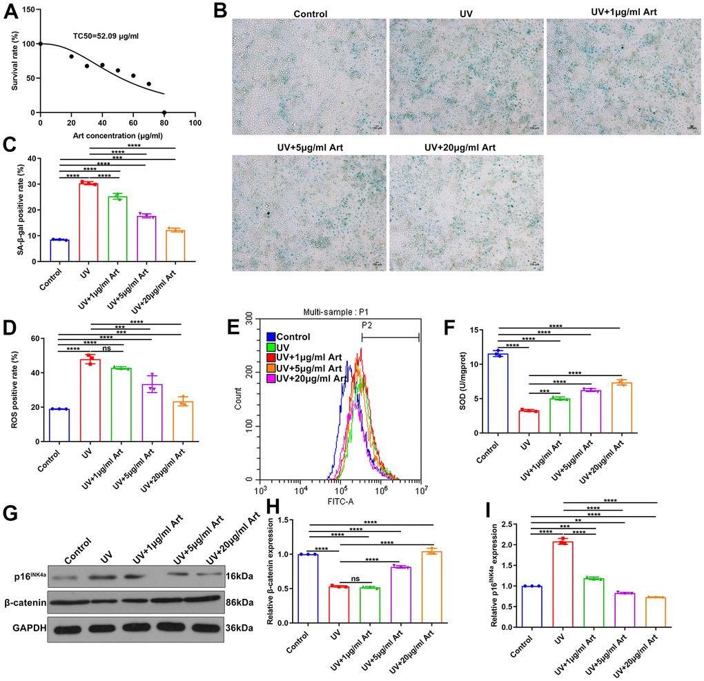 Art treatment reduces cell senescence, p16INK4a expression and intracellular ROS production and increases SOD expression in UV-irradiated HaCaT cells by increasing β-catenin expression