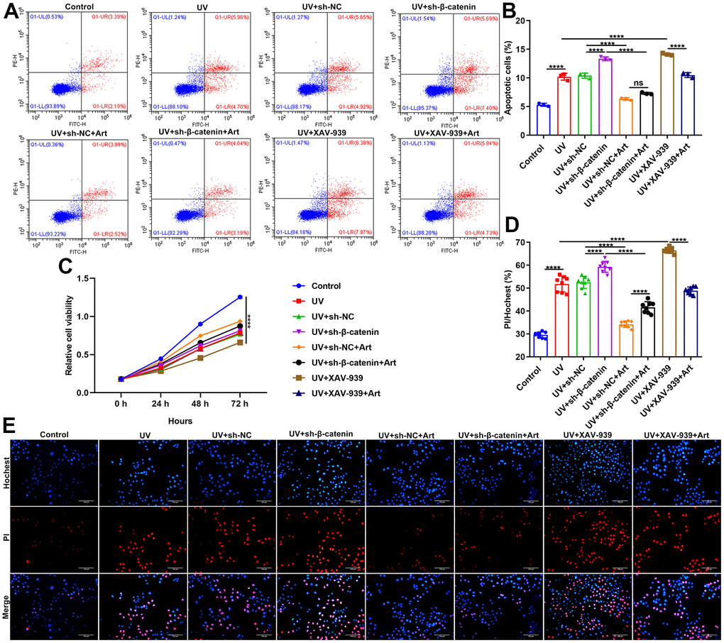 Our flow cytometry results showed that silencing β-catenin induced by sh-β-catenin or XAV-939 markedly exacerbated the apoptosis of UVB-irradiated HaCaT cells. The effects were distinctly ameliorated by Art treatment (Figure 5A, 5B). As shown in Figure 5C, UVB irradiation significantly slowed down the growth rate of HaCaT cells. The inhibitory effects were enhanced when transfection with sh-β-catenin or treatment with XAV-939. Nevertheless, Art treatment distinctly boosted the proliferation of UVB-irradiated cells with β-catenin knockdown. Hoechst/PI staining was applied for investigating the morphological changes of HaCaT cell apoptosis. Our data confirmed that UVB irradiation induced cell apoptosis (Figure 5D, 5E). Silencing β-catenin with sh-β-catenin or inhibiting β-catenin signaling pathway with XAV-939 aggravated the apoptotic effects. Art markedly alleviated the apoptosis of UVB-irradiated cells with silencing or inhibiting β-catenin pathway. Collectively, Art treatment exerted an inhibitory role on apoptosis of UVB-irradiated cells by enhancing β-catenin expression.