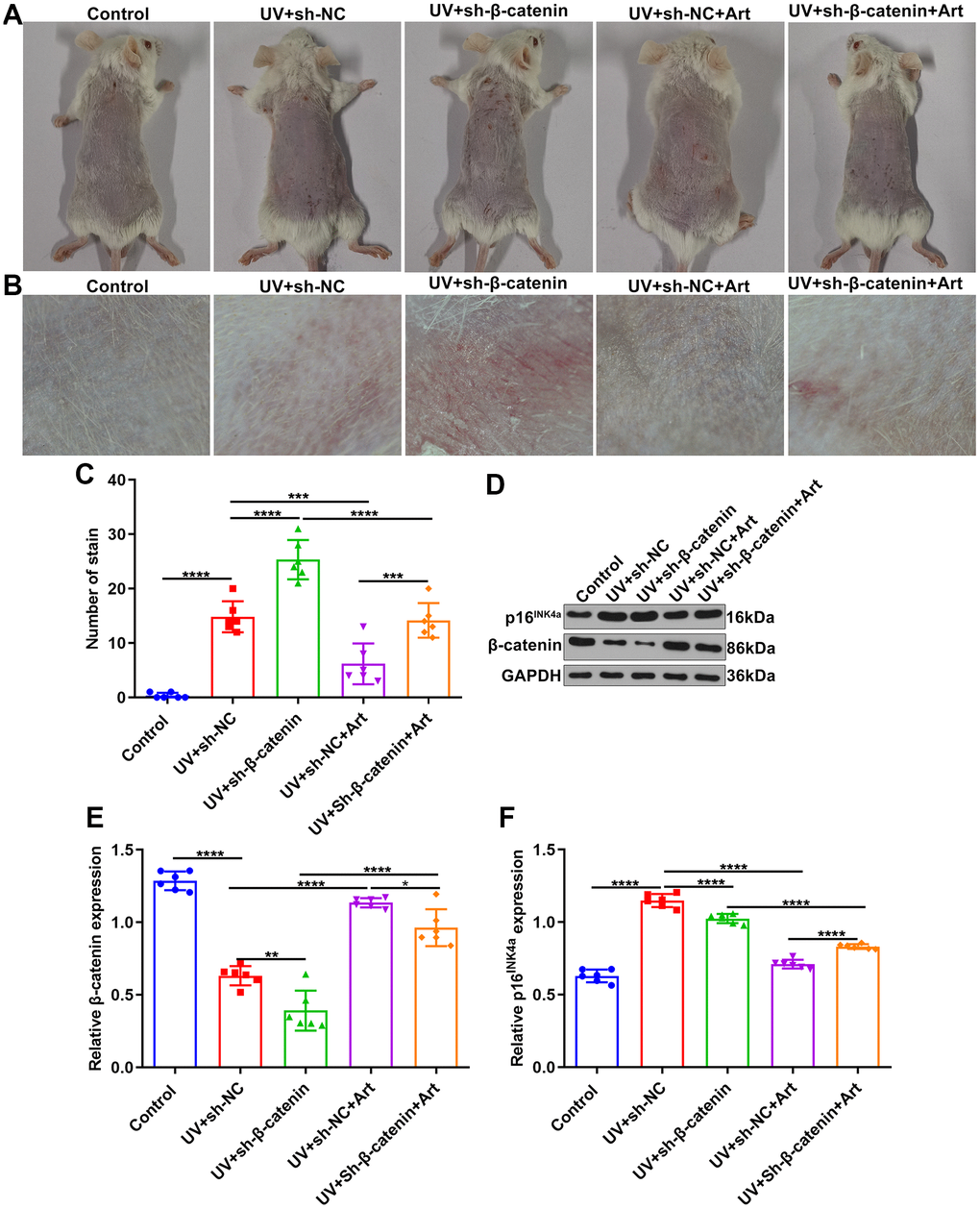 We further observed the effects of Art treatment and β-catenin silencing on UV-irradiated skin photoaging in mice. All mice were randomly divided into control group, UV + sh-NC group, UV + sh-β-catenin group, UV + sh-NC + Art group and UV + sh-β-catenin + Art group (n=6 each group). After 8 weeks, we observed the skin changes on the back of each group of mice. As shown in Figure 6A, 6B, the skin of the mice in the control group was smooth, normal in color, elastic, without wrinkles or sagging. The skin of the mice that were irradiated by UVB had brown patches, rough skin, wrinkle, scales, and lack of elasticity. For mice with sh-β-catenin injection and UVB irradiation, skin shrank, wrinkles deepened, brown patches and scales were prominent, and leather-like appearance appeared. After treatment with Art, skin photoaging of mice was markedly ameliorated. We also quantified the stain number in each group. As shown in Figure 6C, UV irradiation significantly increased the stain number in mice, which was enhanced by β-catenin knockdown. However, Art treatment relieved the stain number in UV-irradiated mice but the therapeutic effect of Art was weakened when β-catenin expression was suppressed. Western blot was utilized for detecting the expression of β-catenin in skin tissues of each group. After UVB irradiation, the decrease in β-catenin expression was found in skin tissues compared to controls (Figure 6D, 6E). Silencing β-catenin markedly aggravated the decrease in β-catenin expression induced by UVB irradiation. Art treatment distinctly elevated the expression of β-catenin in skin tissues of UVB-irradiated mice that were injected with sh-β-catenin. Senescence marker p16INK4a was also detected via western blot (Figure 6D, 6F). The expression of p16INK4a in mouse skin tissues was significantly increased after UVB irradiation. But Art treatment suppressed the expression of p16INK4a in skin tissues.