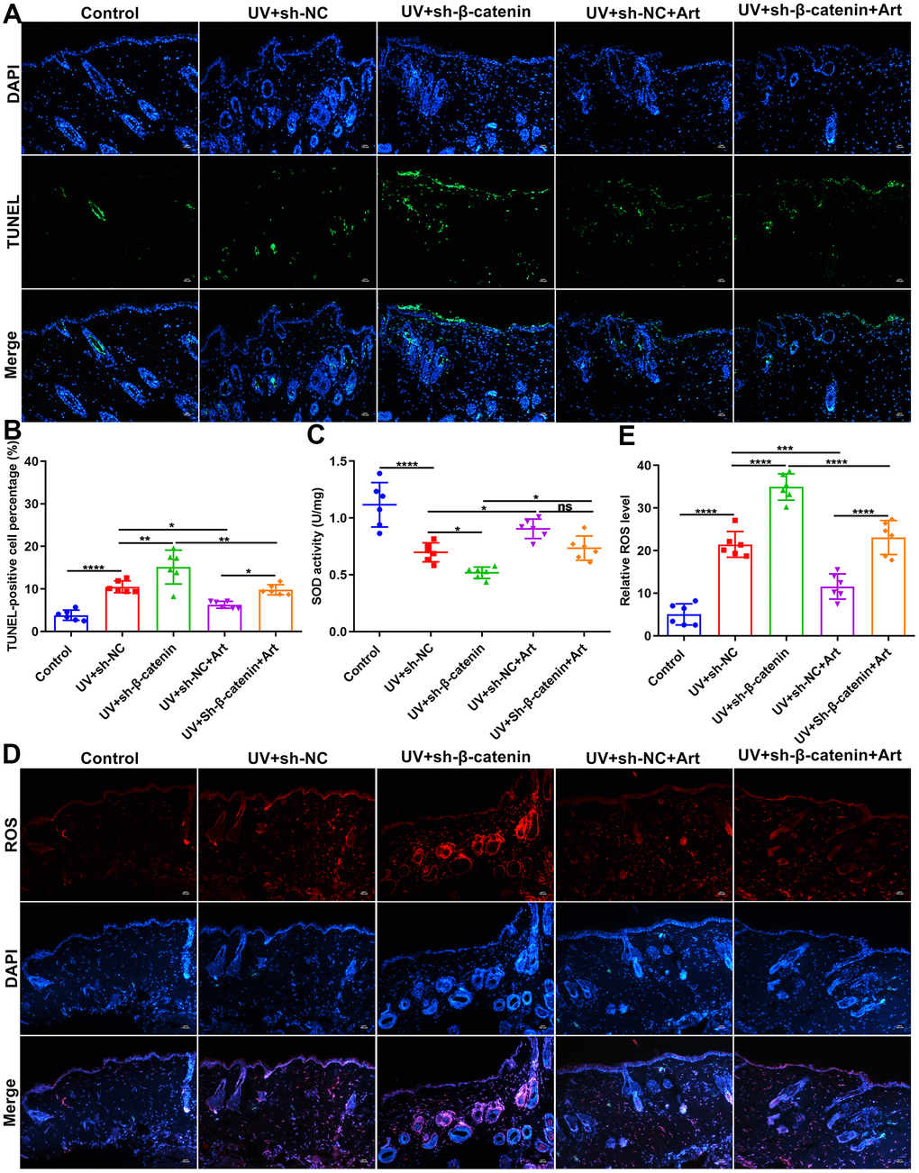 Cell apoptosis in skin tissues of mice was tested by TUNEL staining. Compared to control mice, apoptotic levels were distinctly elevated in skin tissues after UVB irradiation (Figure 7A, 7B). Silencing β-catenin significantly aggravated the apoptosis in UVB irradiated skin tissues. However, Art treatment significantly ameliorated the apoptosis of skin tissues induced by UVB irradiation and sh-β-catenin. The UVB-irradiated skin tissues were collected and ROS and SOD expression was separately detected using immunofluorescence and SOD detection kit. Compared to the matched skin area, intracellular ROS levels were distinctly elevated and SOD levels were significantly decreased in the UVB-irradiated skin tissues (Figure 7C–7E). The increase in ROS and the decrease in SOD in the UVB-irradiated skin tissues were exacerbated by silencing β-catenin expression. Nevertheless, Art treatment markedly suppressed ROS production and promoted SOD production induced by UVB irradiation and β-catenin knockdown. These data suggested that Art treatment inhibited apoptosis and ROS production as well as promoted SOD production in UVB-irradiated skin tissues of mice through enhancing β-catenin expression.