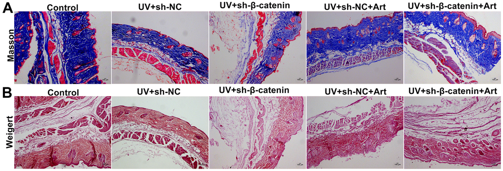 Masson staining was utilized for detecting collagen fiber in skin tissues of each group. In the control group, collagen fiber was arranged intact. However, we found that collagen fiber was significantly decreased in UVB-irradiated skin tissues compared to controls (Figure 8A). Furthermore, silencing β-catenin induced by sh-β-catenin significantly aggravated the decrease in collagen fiber of UVB-irradiated skin tissues. Art treatment significantly ameliorated collagen fiber degradation induced by UVB irradiation and β-catenin silencing. By Weigert staining, we evaluated elastic fiber of skin tissues. The elastic fibers on the skin in the control group were neat (Figure 8B). After UVB irradiation, part of the elastic fiber was broken, abnormally proliferating, crimping, bifurcation, and interweaving, which was aggravated by β-catenin knockdown. Nevertheless, Art treatment significantly ameliorated elastic fiber damage caused by UVB irradiation and β-catenin silencing.